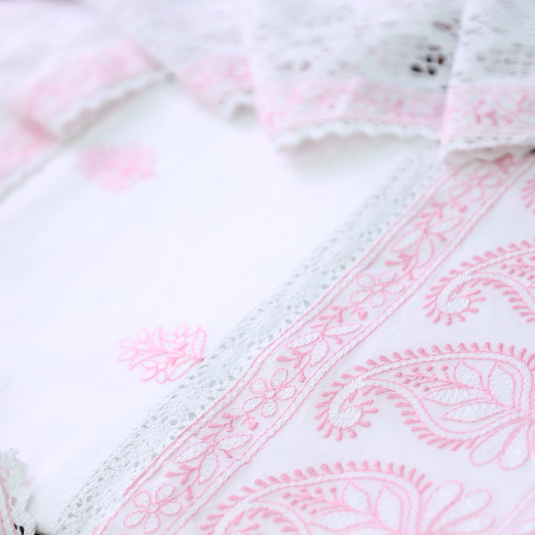 Description- This graceful Cotton suit set showcases delicate floral thread embroidery enhanced with intricate embroidery detailing along the hem, lending a refined handcrafted appeal. The look is beautifully complemented by a lightweight chiffon dupatta adorned with hand-painted motifs and finished with fine crochet work, creating an airy, elegant ensemble perfect for summer festivities and daytime occasions.