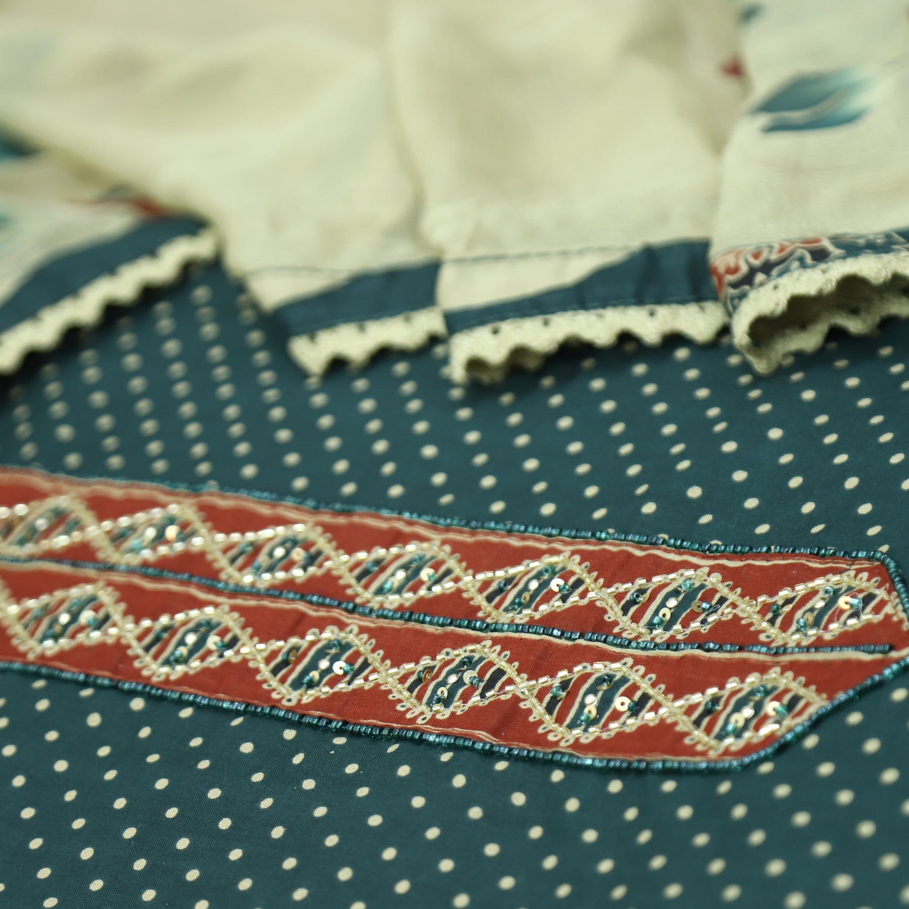 Description- This cotton suit set features a beautifully polak dot-printed cotton top enhanced with a delicate kardana and moti work patch on the yoke for an elegant touch. It is paired with a comfortable solid cotton bottom and complemented by a hand-painted chiffon dupatta that adds softness and charm. A graceful choice for everyday wear with a hint of artisanal detail..