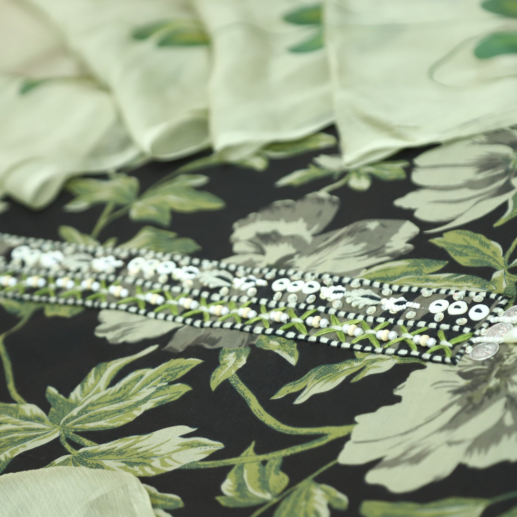 Sunaina Forest Green Moti Work Patch in Floral Printed Cotton Suit Set