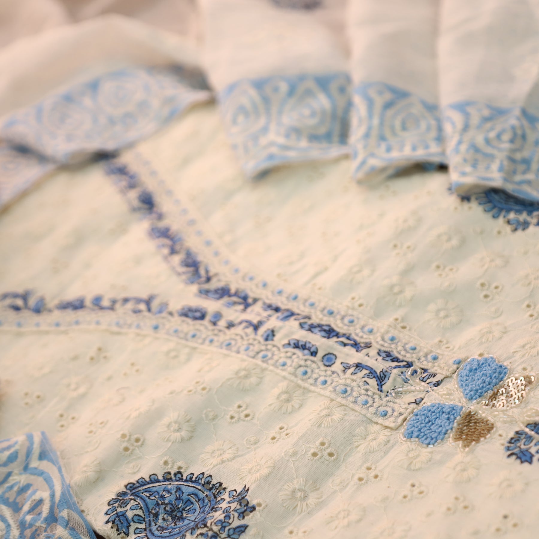 Description: A graceful cotton schiffli 3-piece suit set featuring delicate block printed detailing on the top, highlighted with an elegant lace-worked neckline. It is paired with a printed cotton bottom and a beautifully coordinated cotton dupatta adorned with thread work, block prints, and cut-work hem, creating a soft and sophisticated ethnic look .