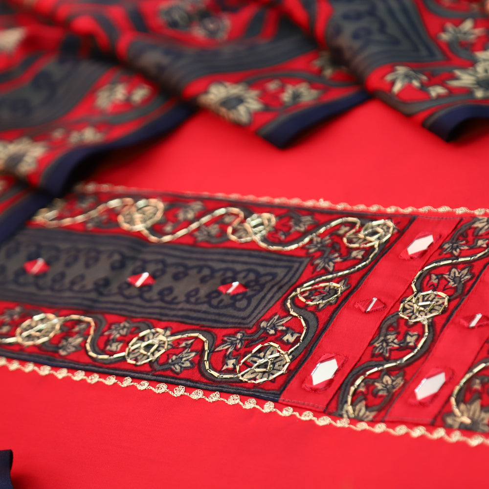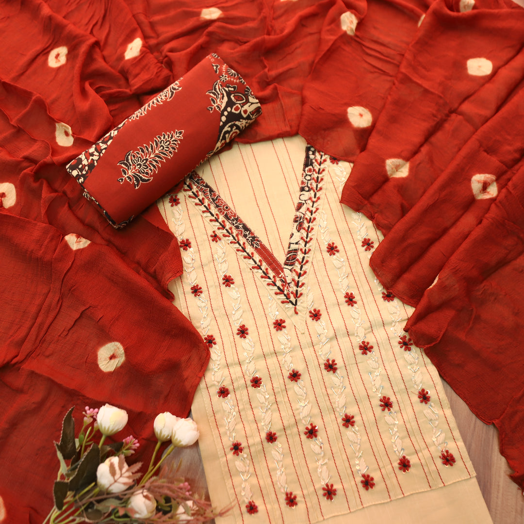 Roshni Cherry Red Thread Embroidered Yoke on Ajrak Printed Cotton Suit Set