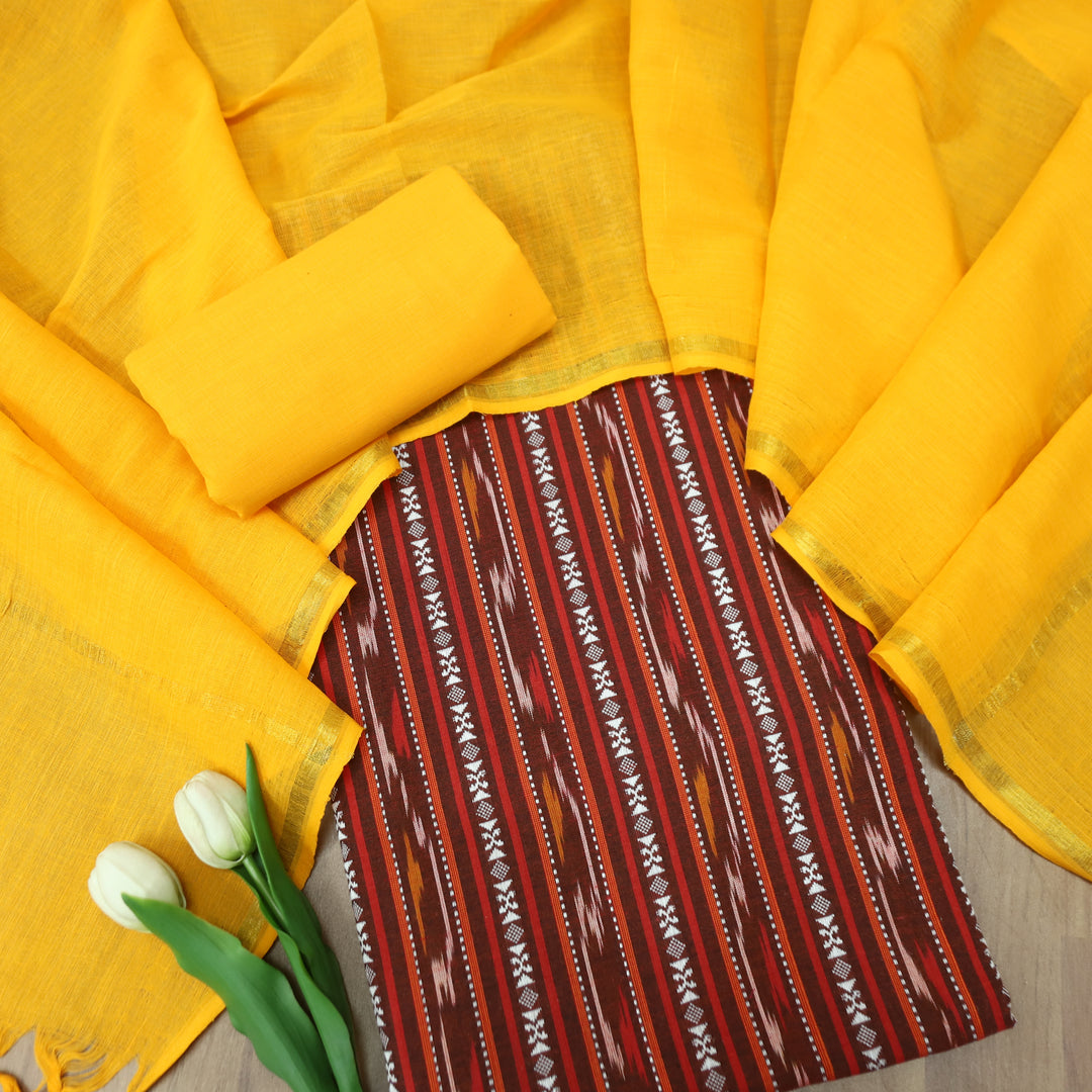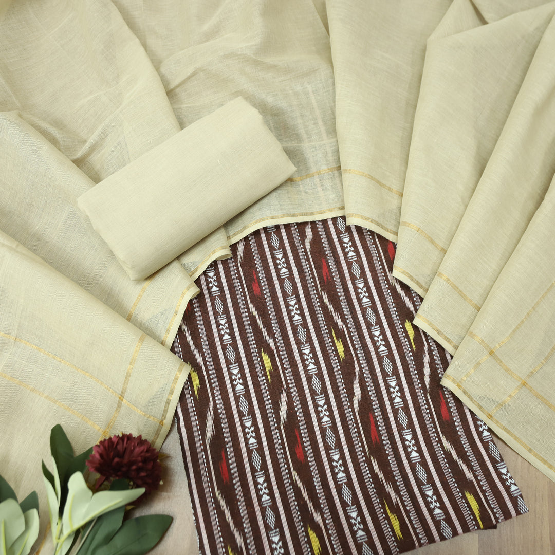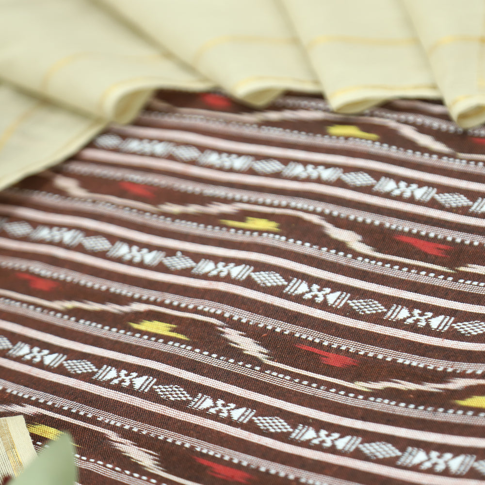 Droupadi Faded Brown All Over Thread and Sambhalpuri Ikkat Style Weaved Cotton Set