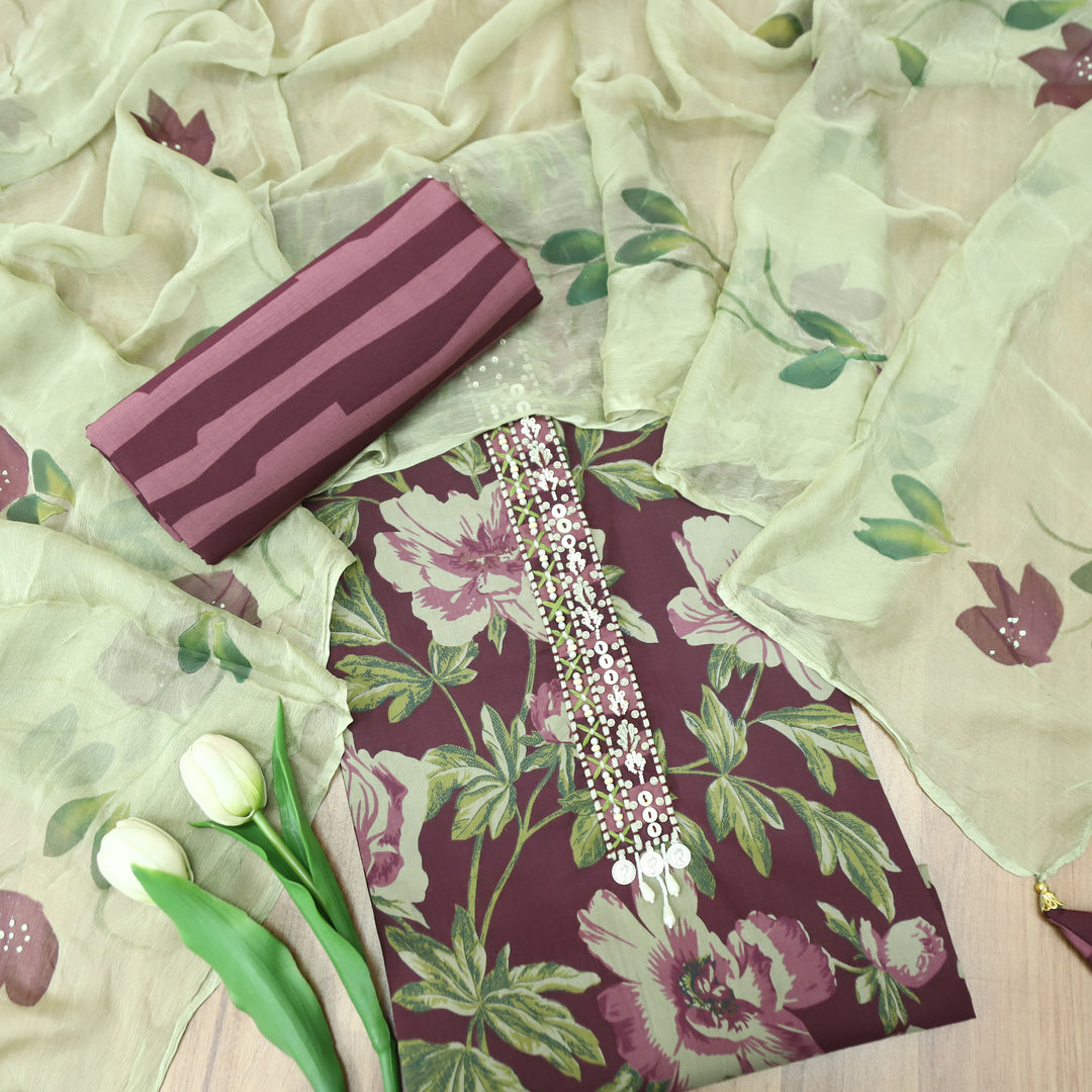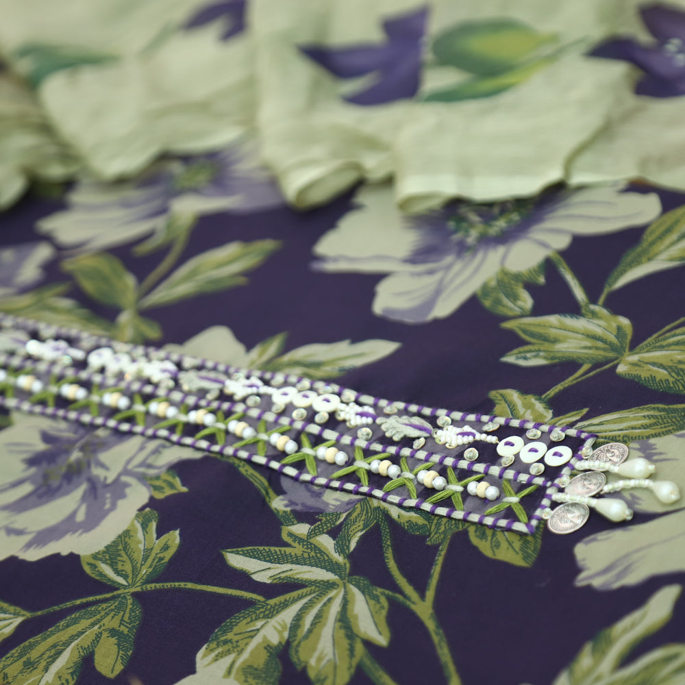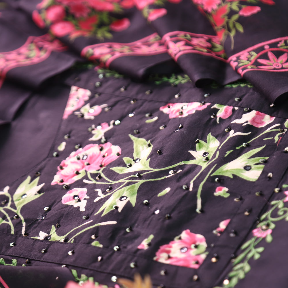 Yashvi Black with Pink Floral Print Yoke Moti and Patra Work Cotton 3 Piece Set