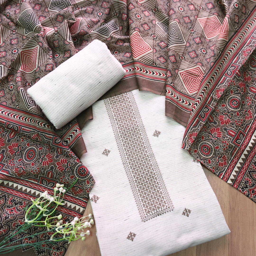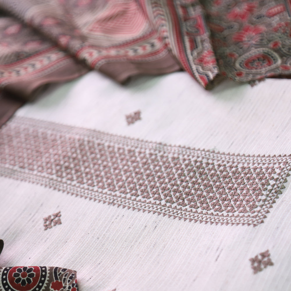 Aathiya Shell White with Tan Thread Embroidered and Buti Work Cotton Suit Set