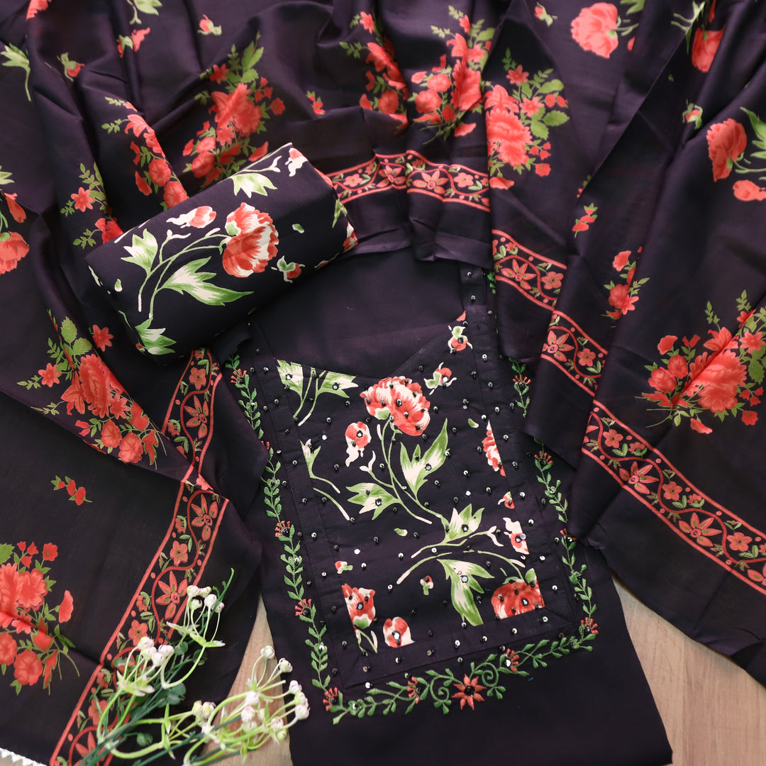 Yashvi Black with Red Floral Print Yoke Moti and Patra Work Cotton Suit Set