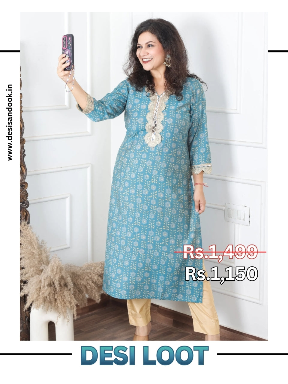 Sohni Turq Teal V Neck with Embellish Mirror Lace and Foil Work Printed Modal Kurti
