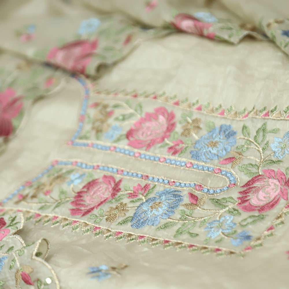 Ekta Hazel Beige with Blue Floral Embroidered Neck Work Crushed Tissue Suit Set