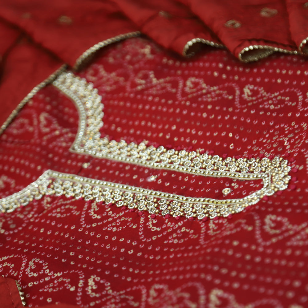 Description-Exude traditional elegance with this vibrant modal cotton top intricately designed with classic Bandhani print and an exquisitely embellished Stone and zari neckline that adds a festive sparkle. It is paired with a matching cotton silk dupatta, adorned with delicate threadwork and sequine accents, lending the ensemble a regal charm. Complete with a solid matching bottom, this set is perfect for festive gatherings, weddings, and cultural celebrations. ./p>