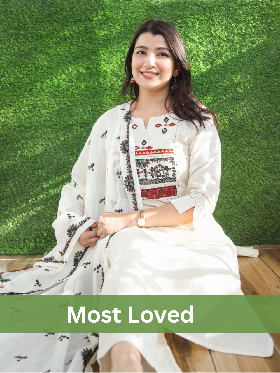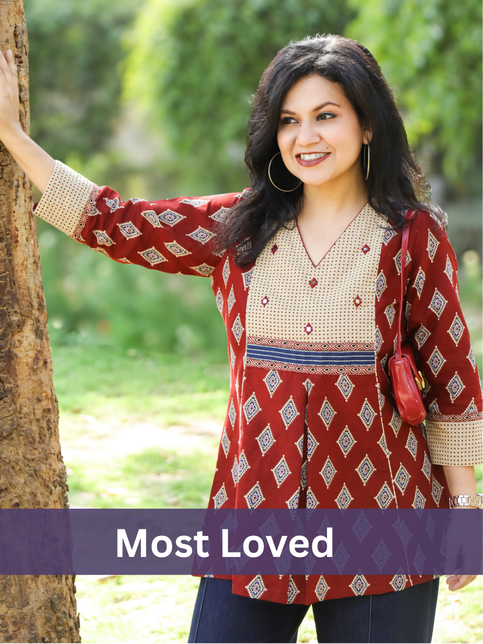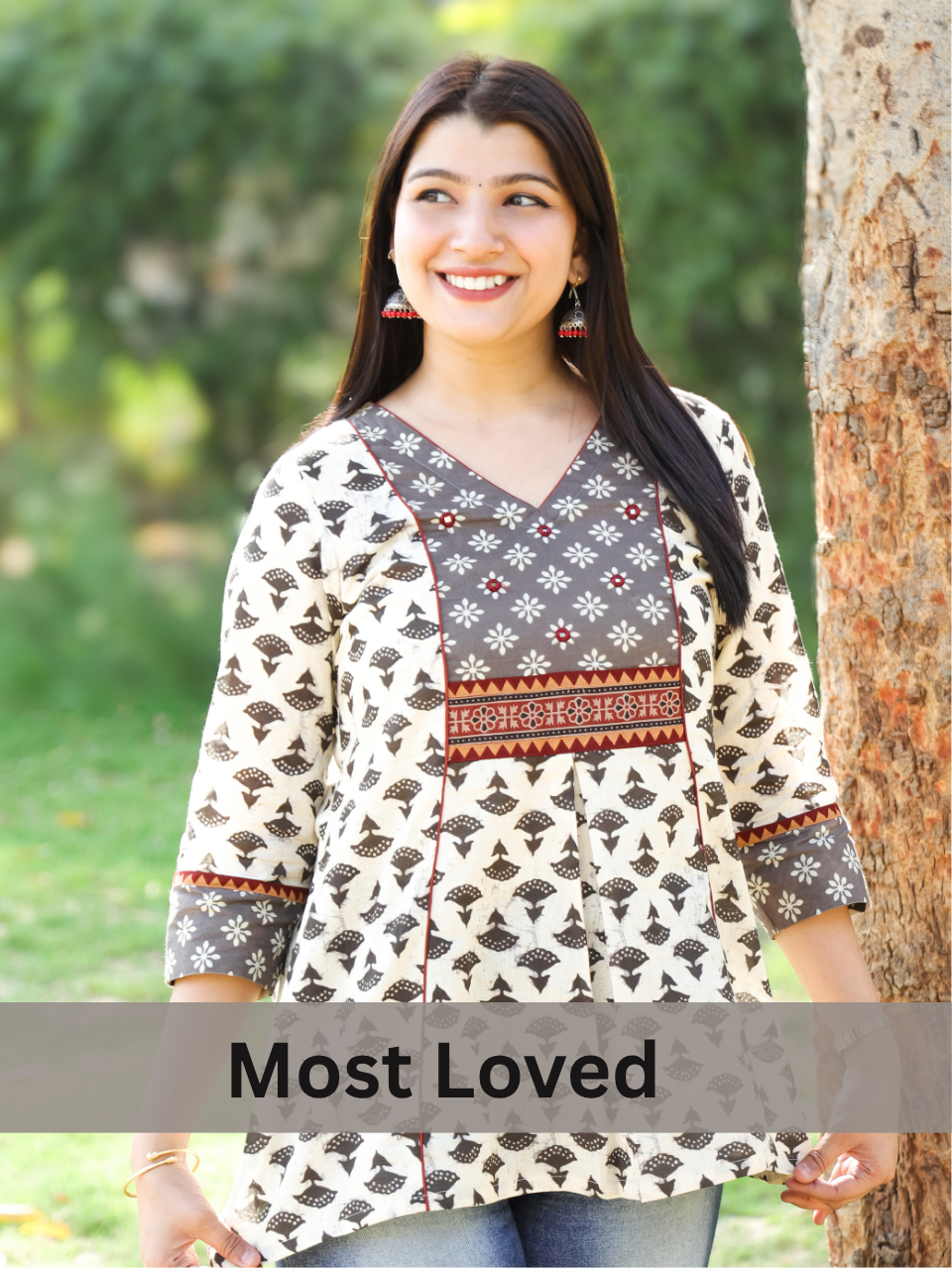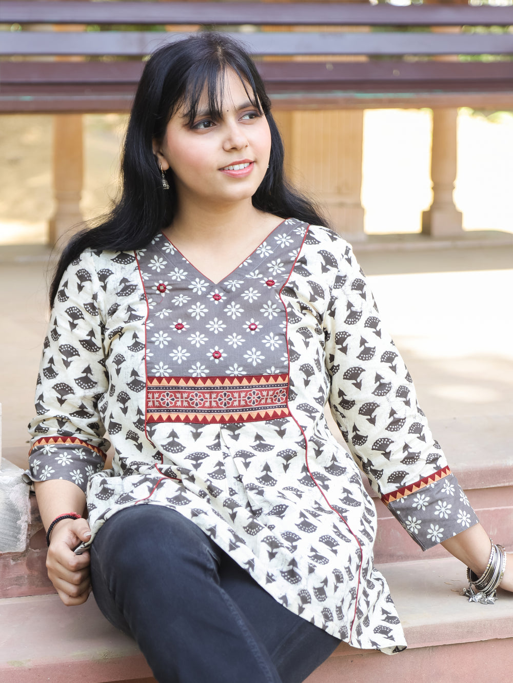 Madhvi Latte Beige with Dabu Printed Yoke with Mirror Work Short Cotton Kurti