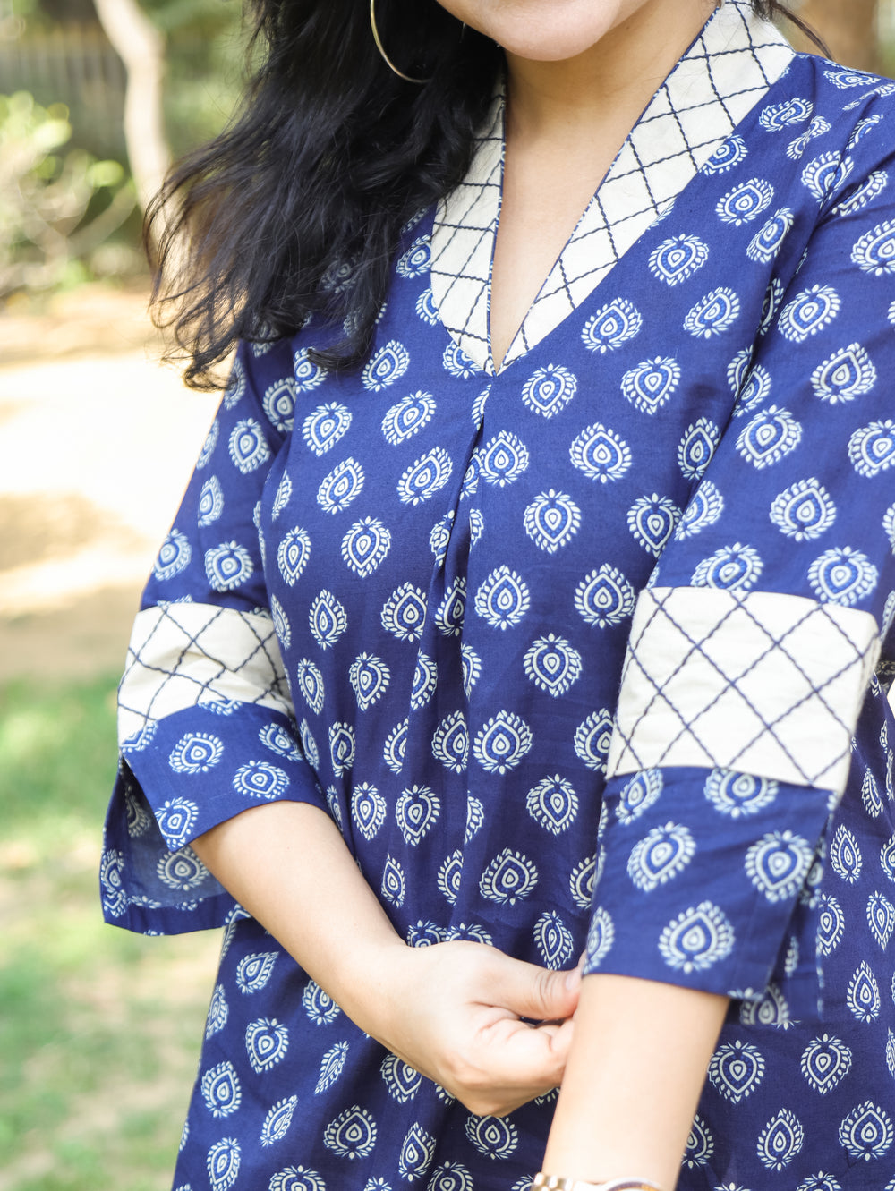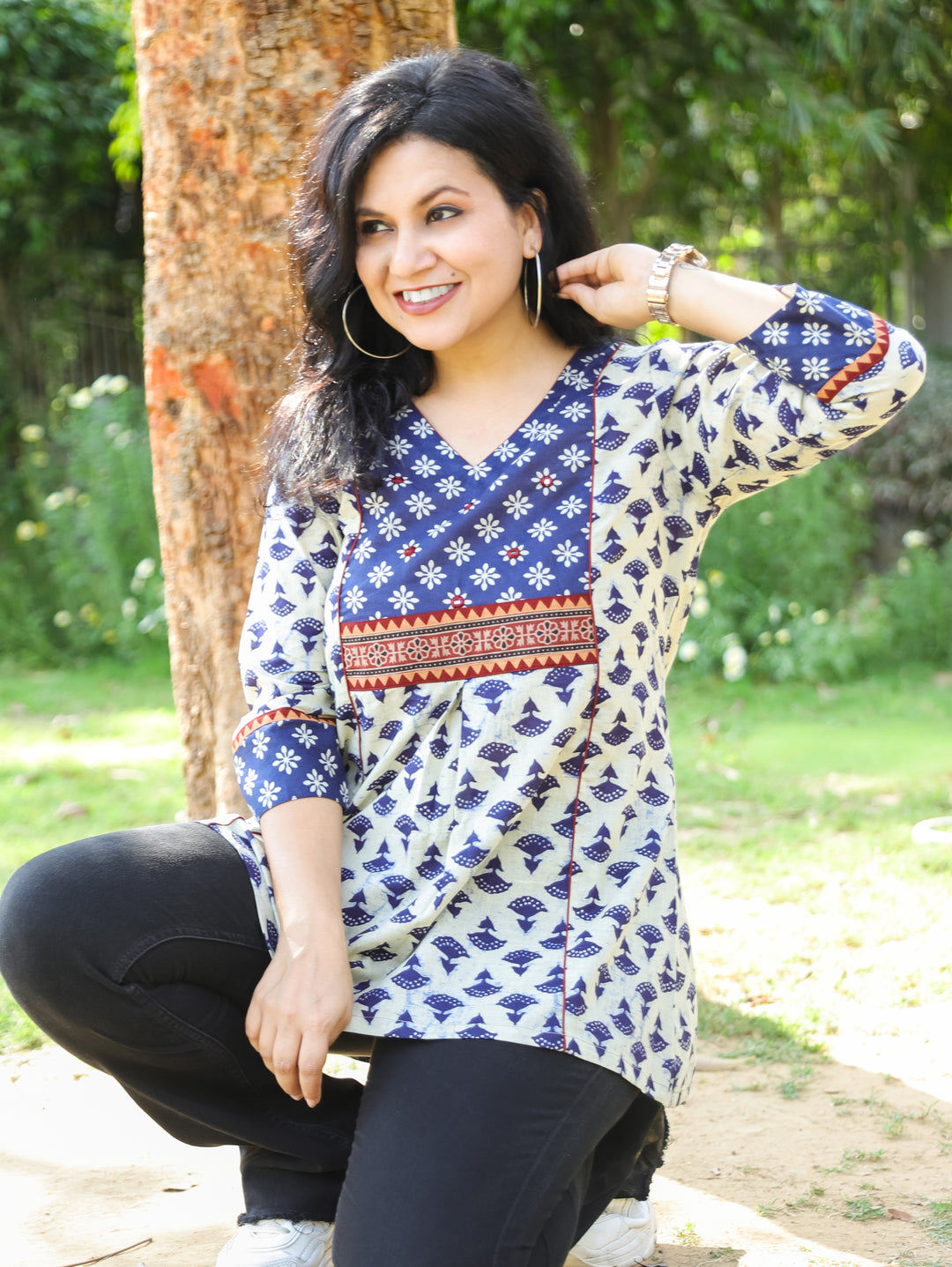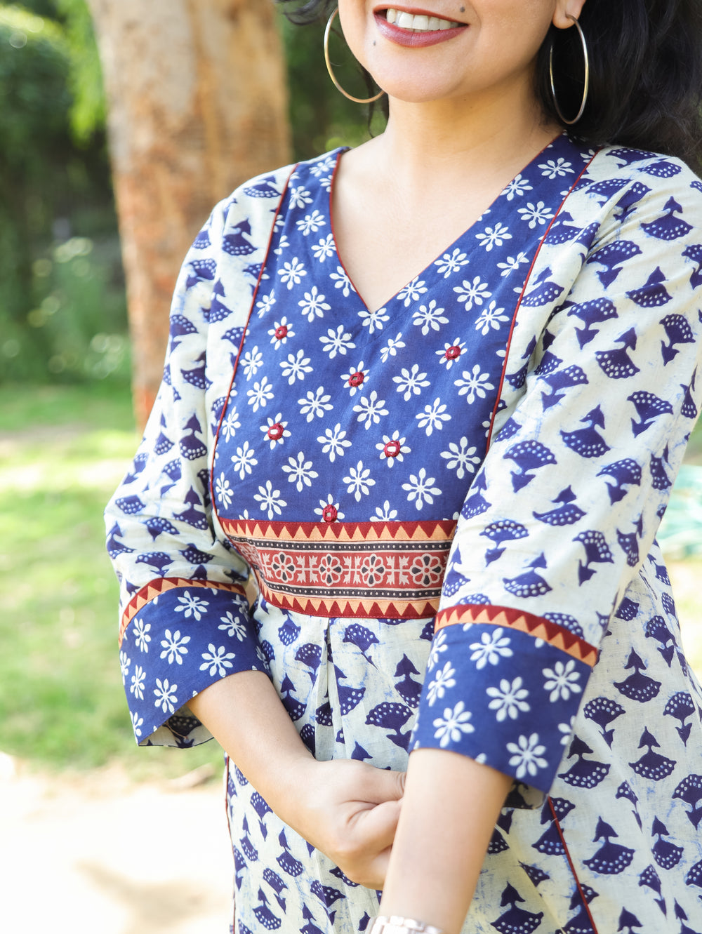 Madhvi Indigo Blue with Dabu Printed Yoke with Mirror Work Short Cotton Kurti