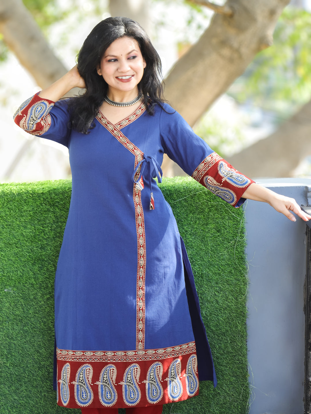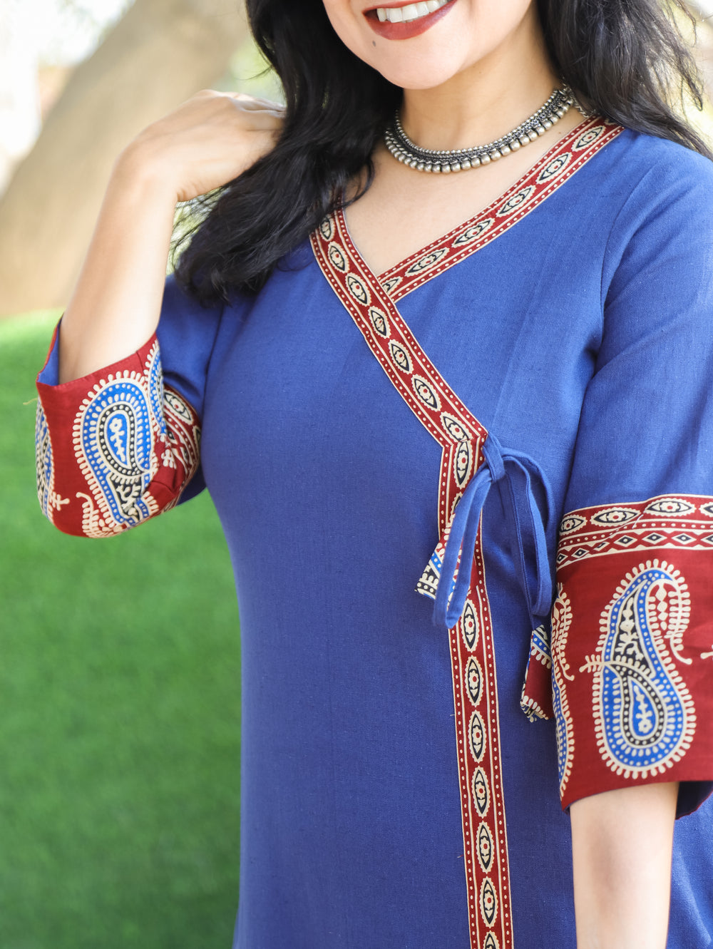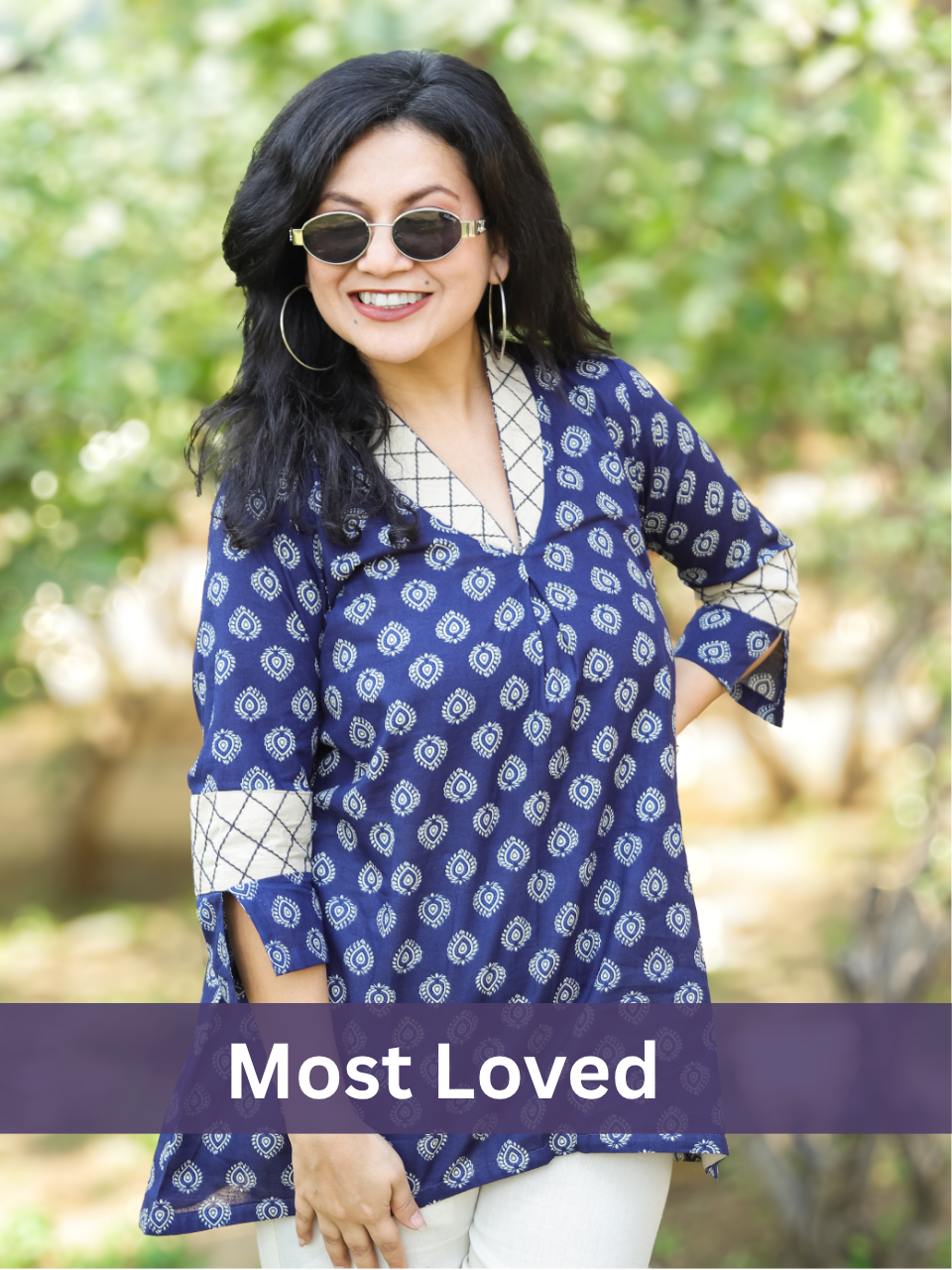 Madhvi Indigo Blue with Dabu Printed Yoke with Mirror Work Short Cotton Kurti