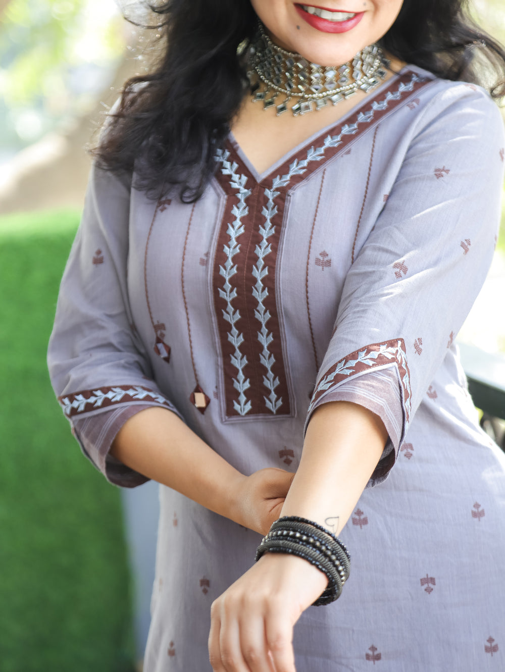 Aruroopi Slate Grey V Neck with Mirror and Thread Wevaed South Cotton Kurti