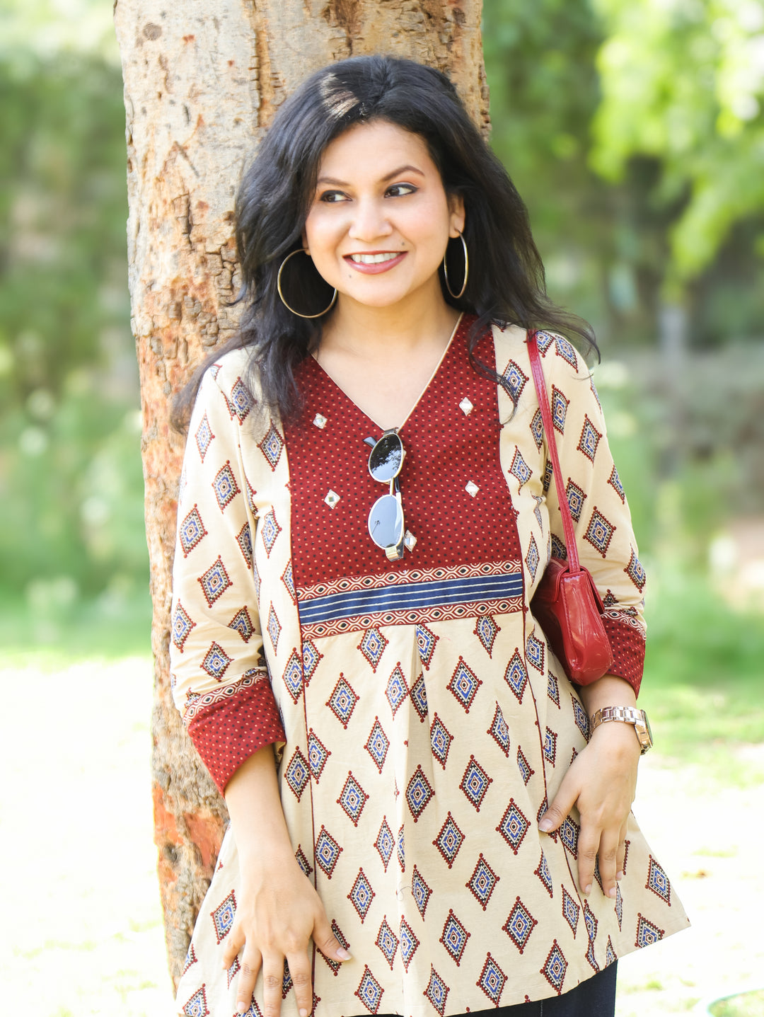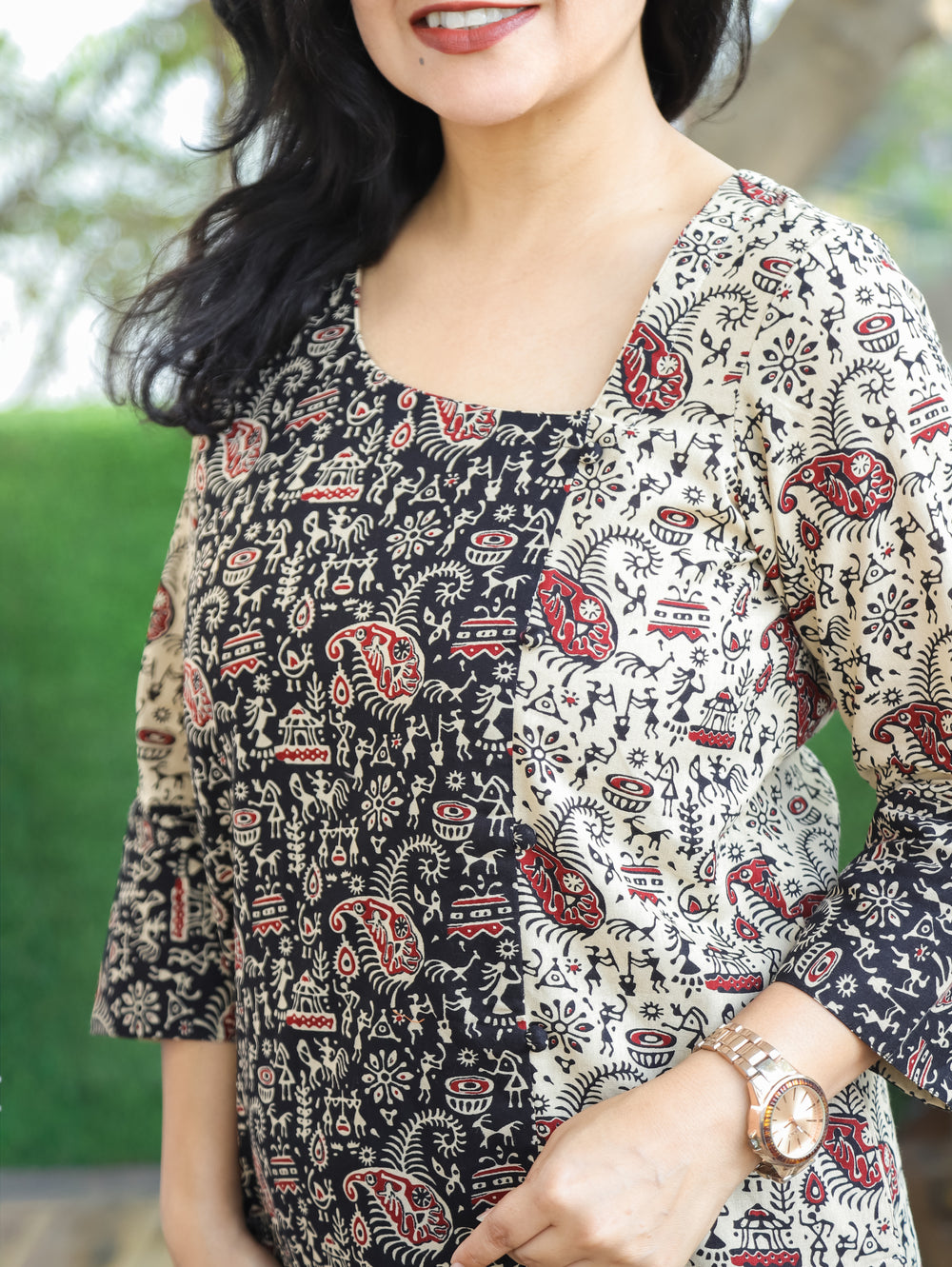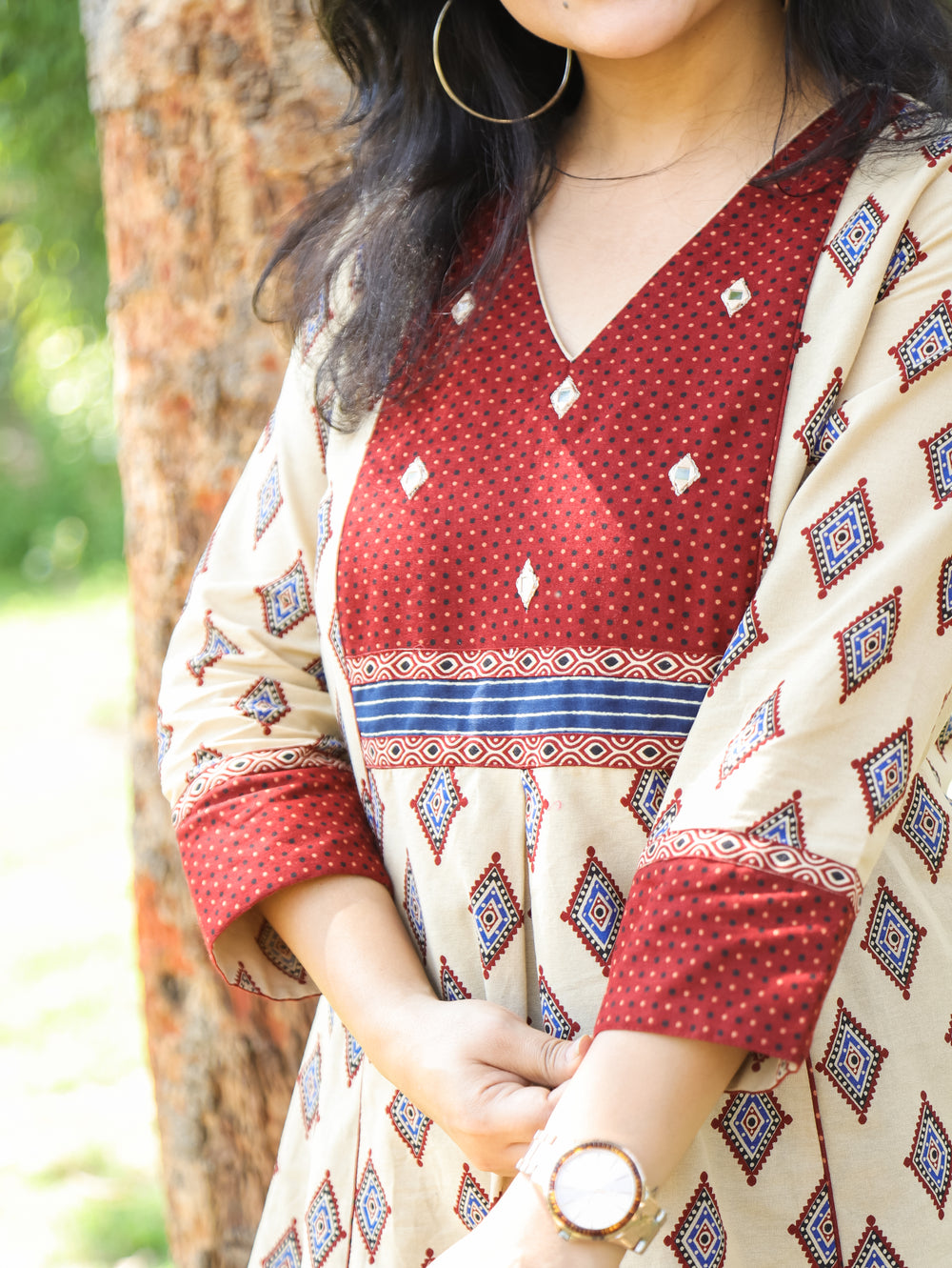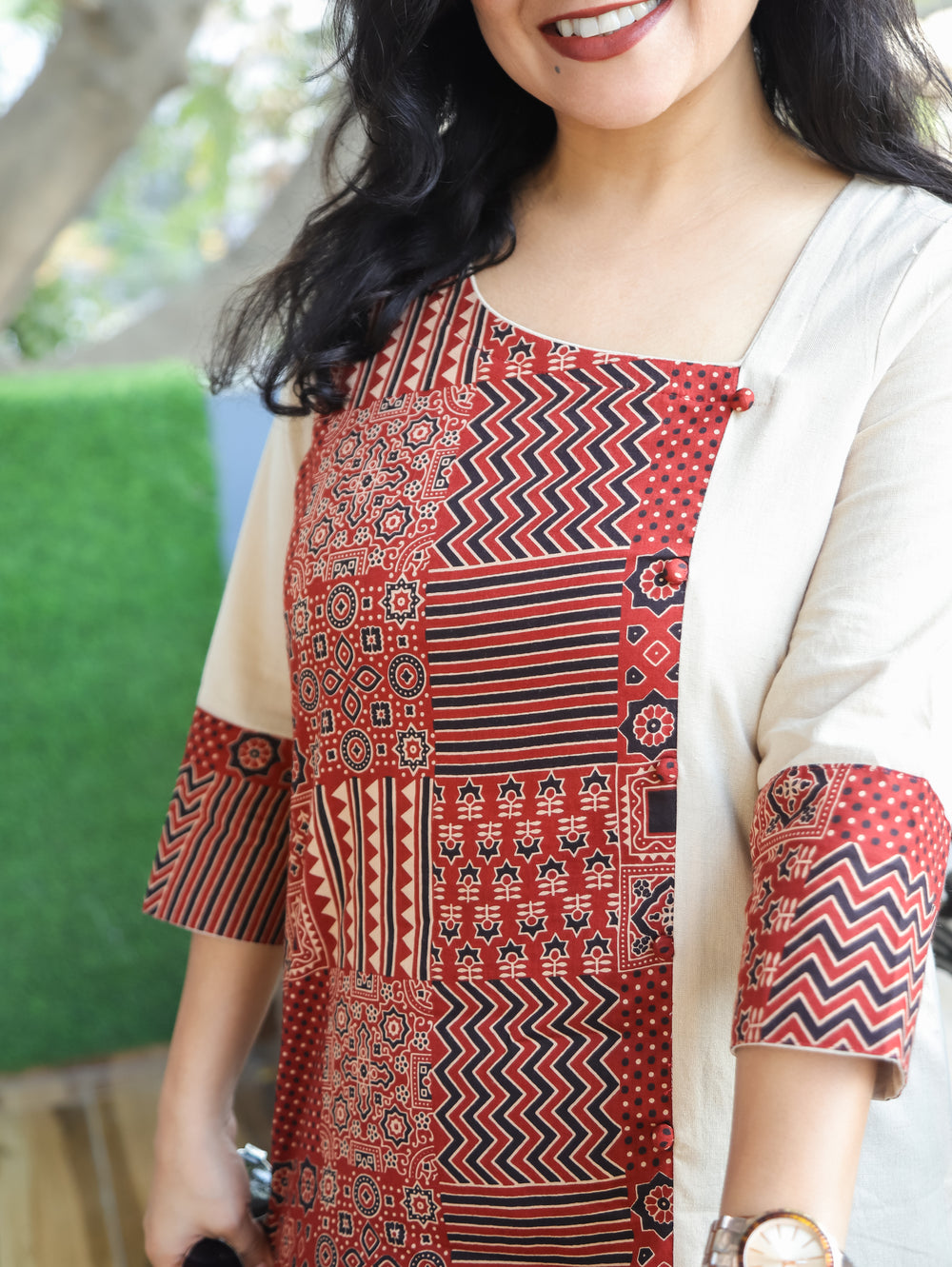 Khushi Barn Red Button Work in Beige Kalamkari Floral Printed Panel Cotton Kurti
