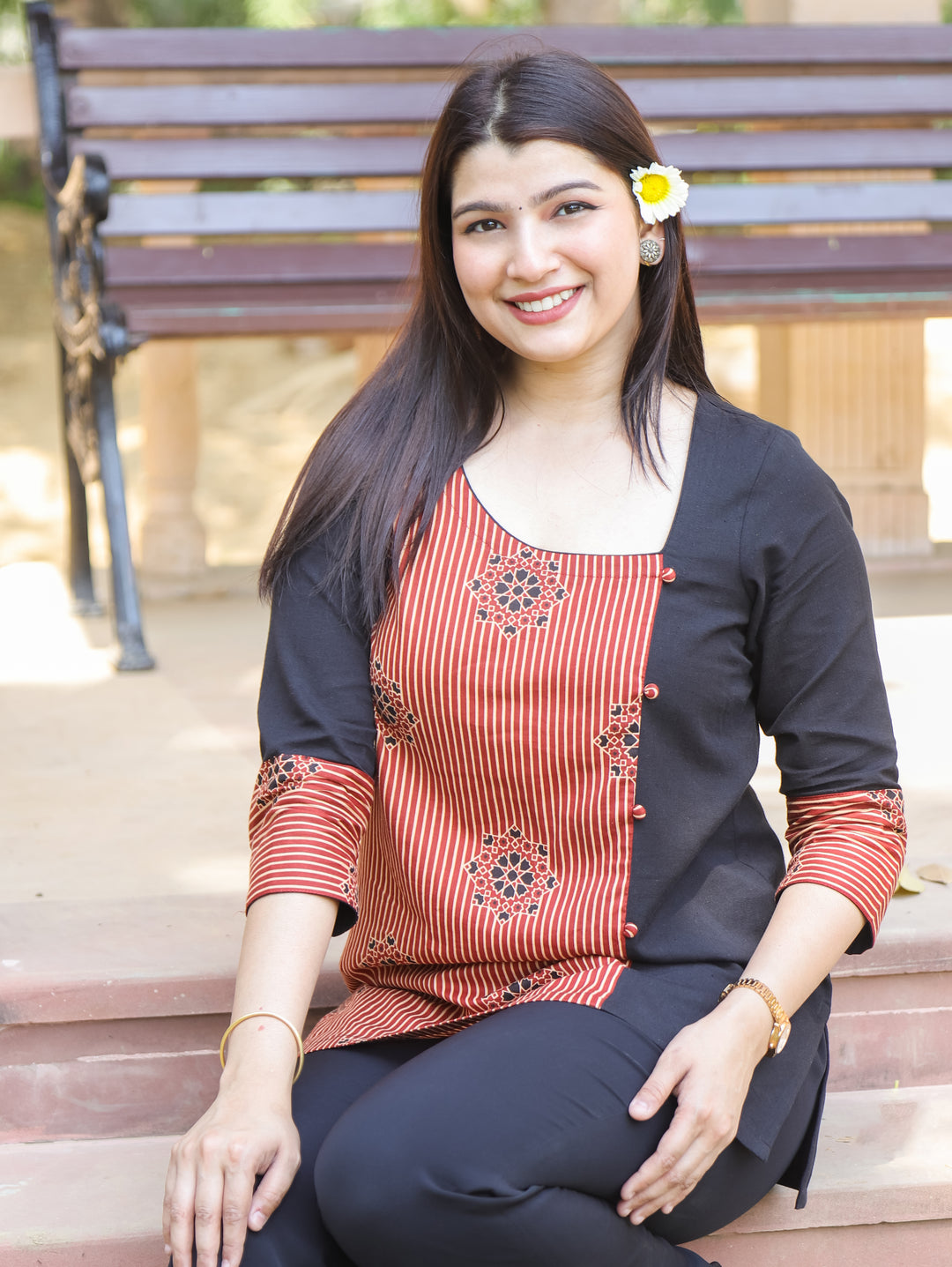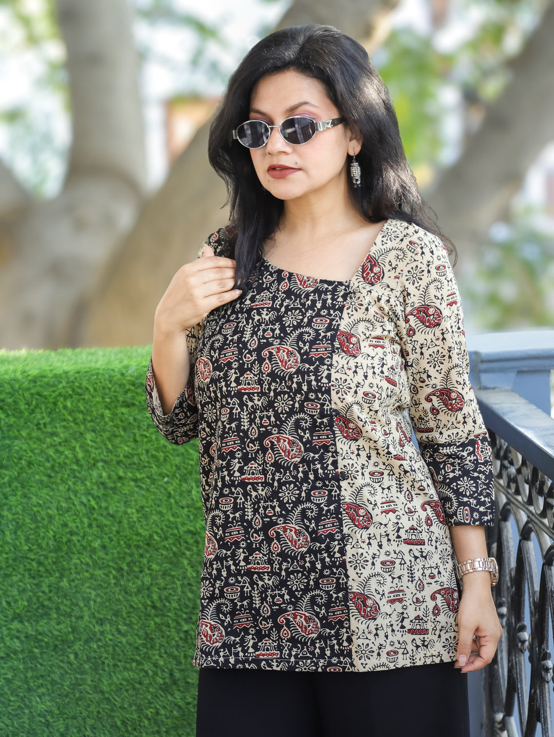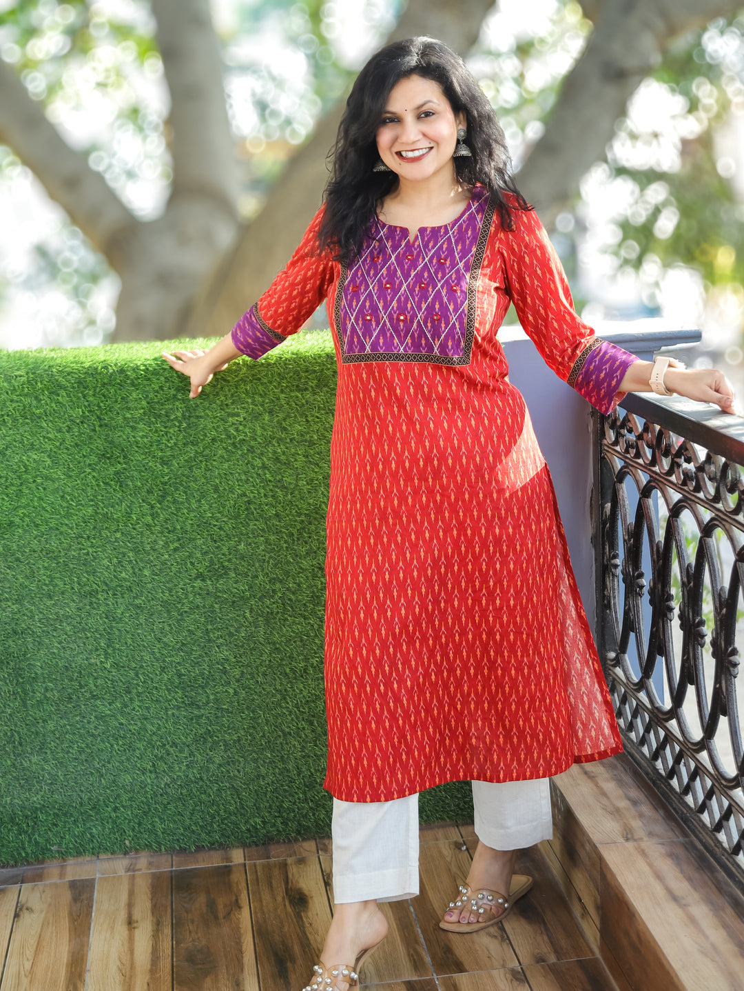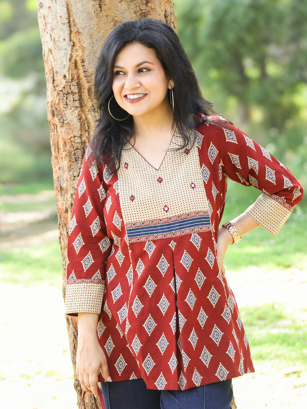 Khushi Barn Red Button Work in Beige Kalamkari Floral Printed Panel Cotton Kurti