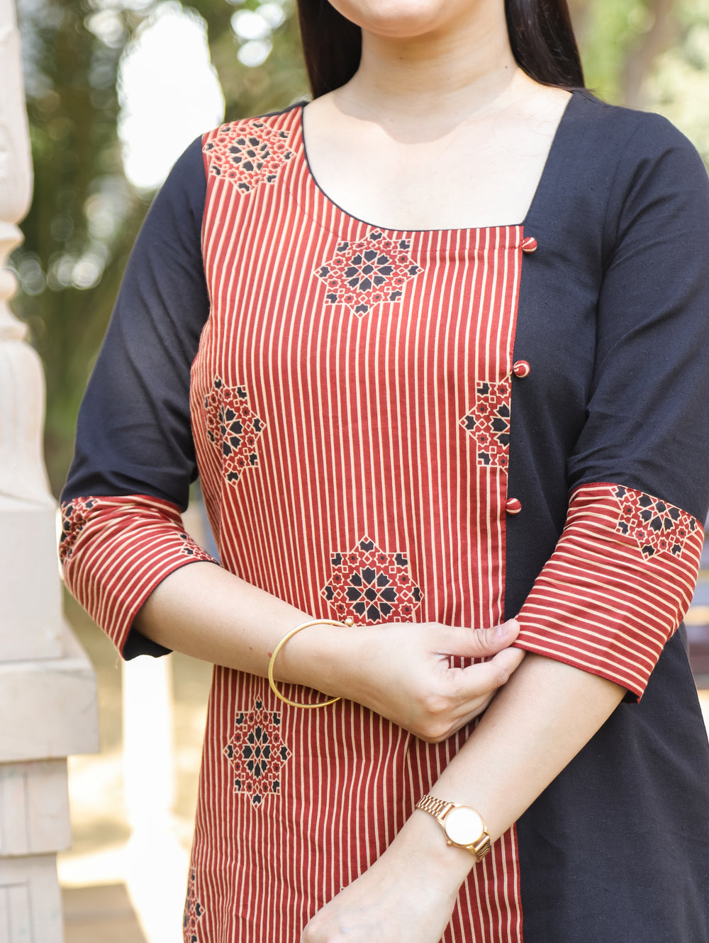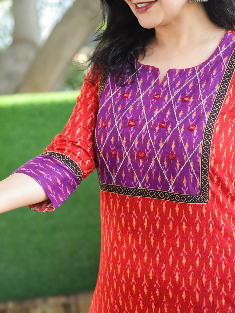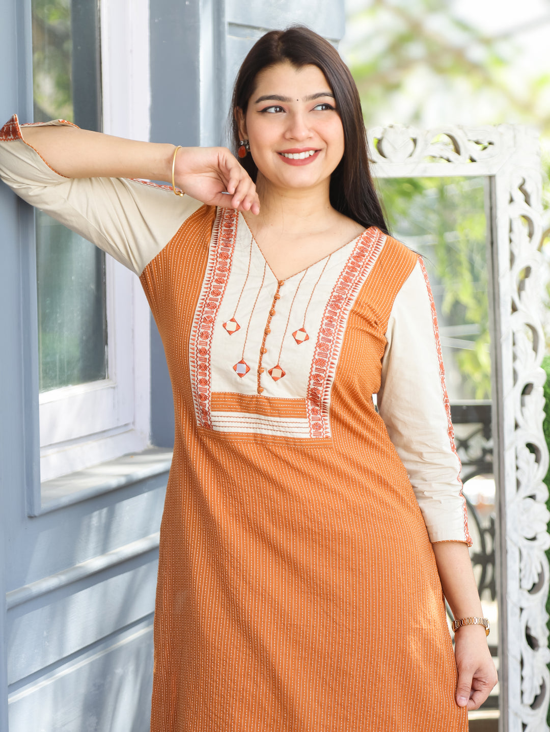 Saundraya Tangerine Rust Mirror with Potli Button Work Yoke Running Stitch Cotton Kurti
