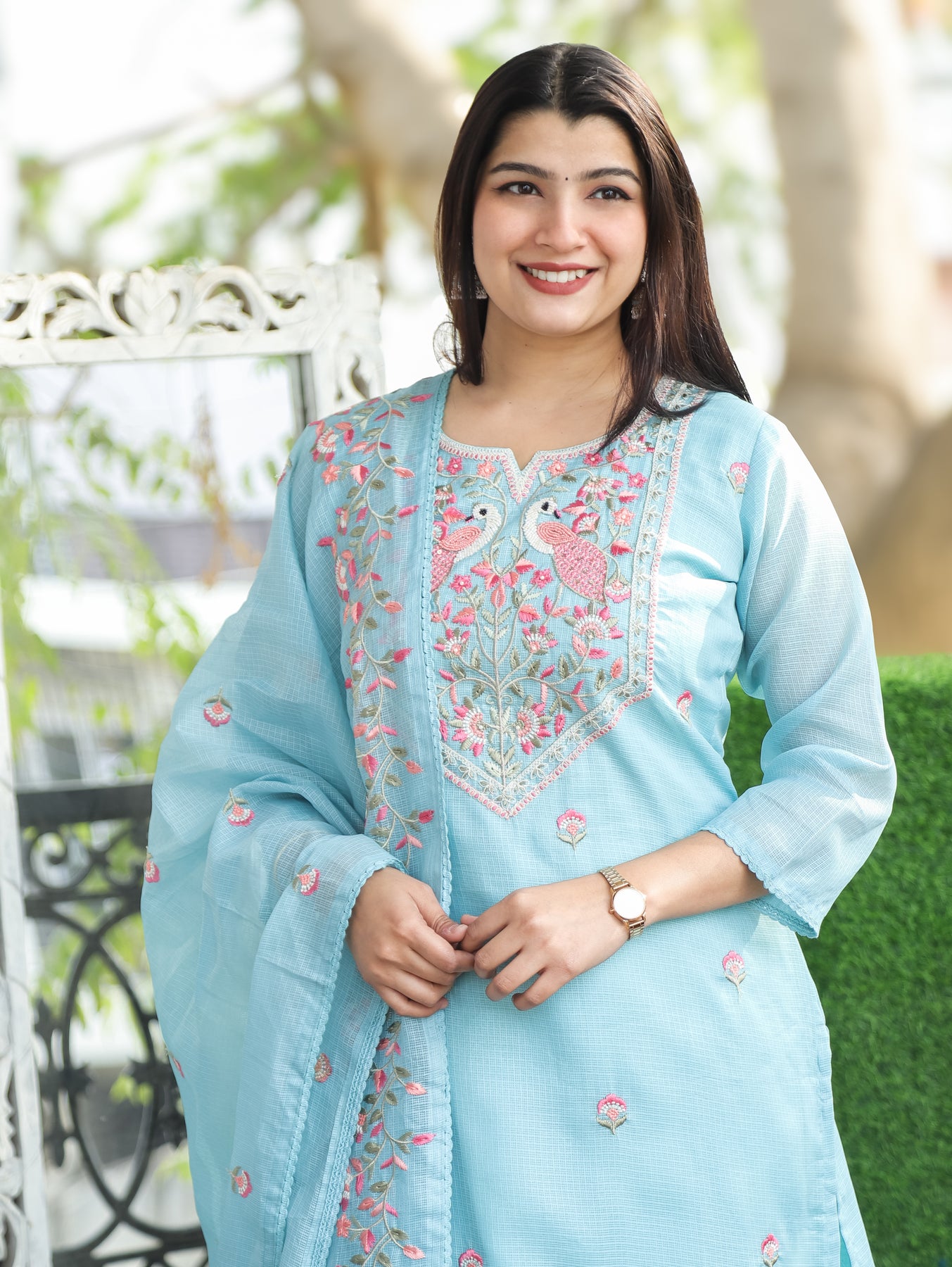 Aadhira Powder Blue Embroidered Yoke with Moti Work Kota Doriya 3 Piece Set