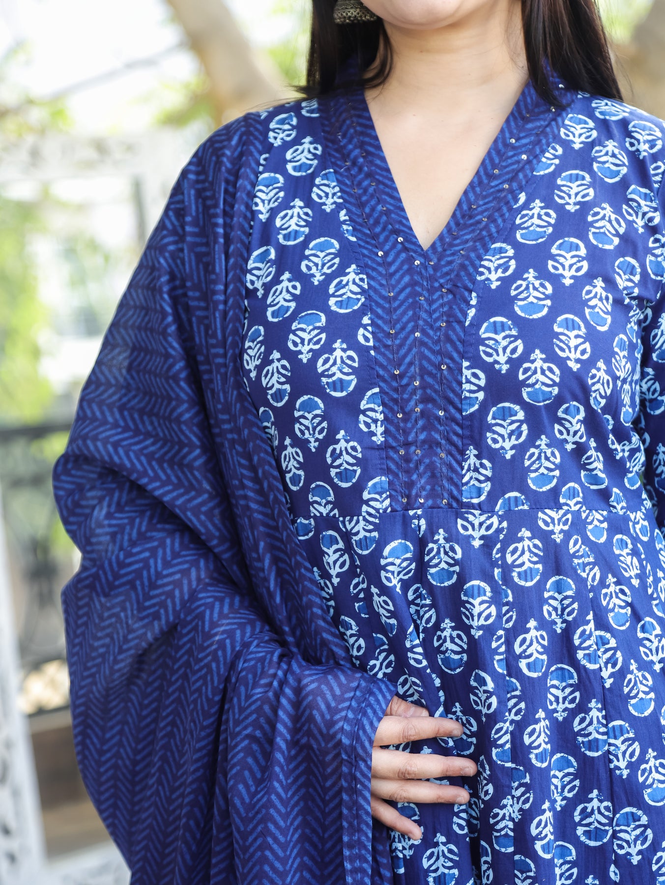 Description- A beautifully crafted cotton stitched v neck Anarkali 3-piece set featuring all-over Dabu print on the top, bottom, and dupatta. The rich earthy tones and intricate motifs add a traditional charm, making it a perfect blend of comfort, elegance, and everyday grace.