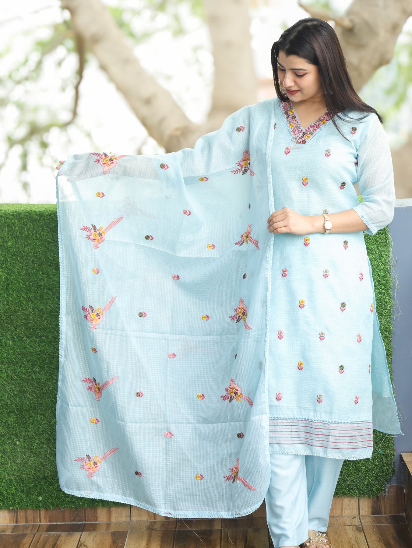WORK- A breezy and elegant Kota Doriya stitched 3-piece set crafted in a soothing shade. The kurta features a beautifully embellished highlighted with delicate thread embroidery and floral motifs along the hem. The lightweight dupatta comes adorned with matching floral embroidery and scalloped edges, adding a graceful finishing touch. Paired with comfortable matching bottoms, this set is perfect for daytime outings