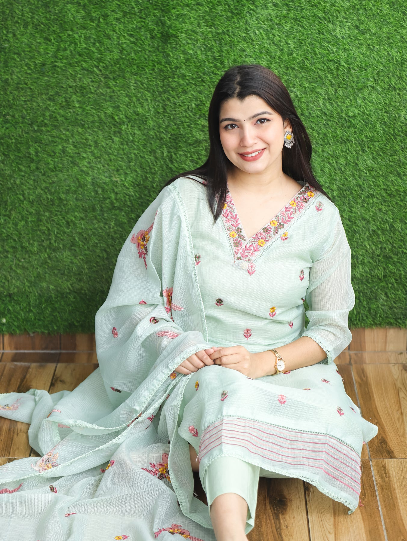 Madhavi Minty Green All Over Embroidered Work with V Neck Kota Doriya 3 Piece Set