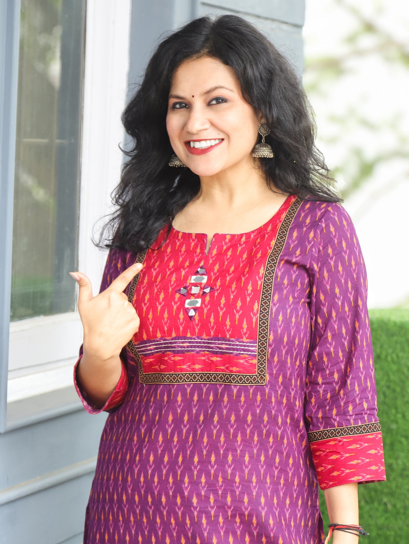 Kesariya Purple with Pink Yoke with Mirror Work Ikkat Printed Cotton Kurti