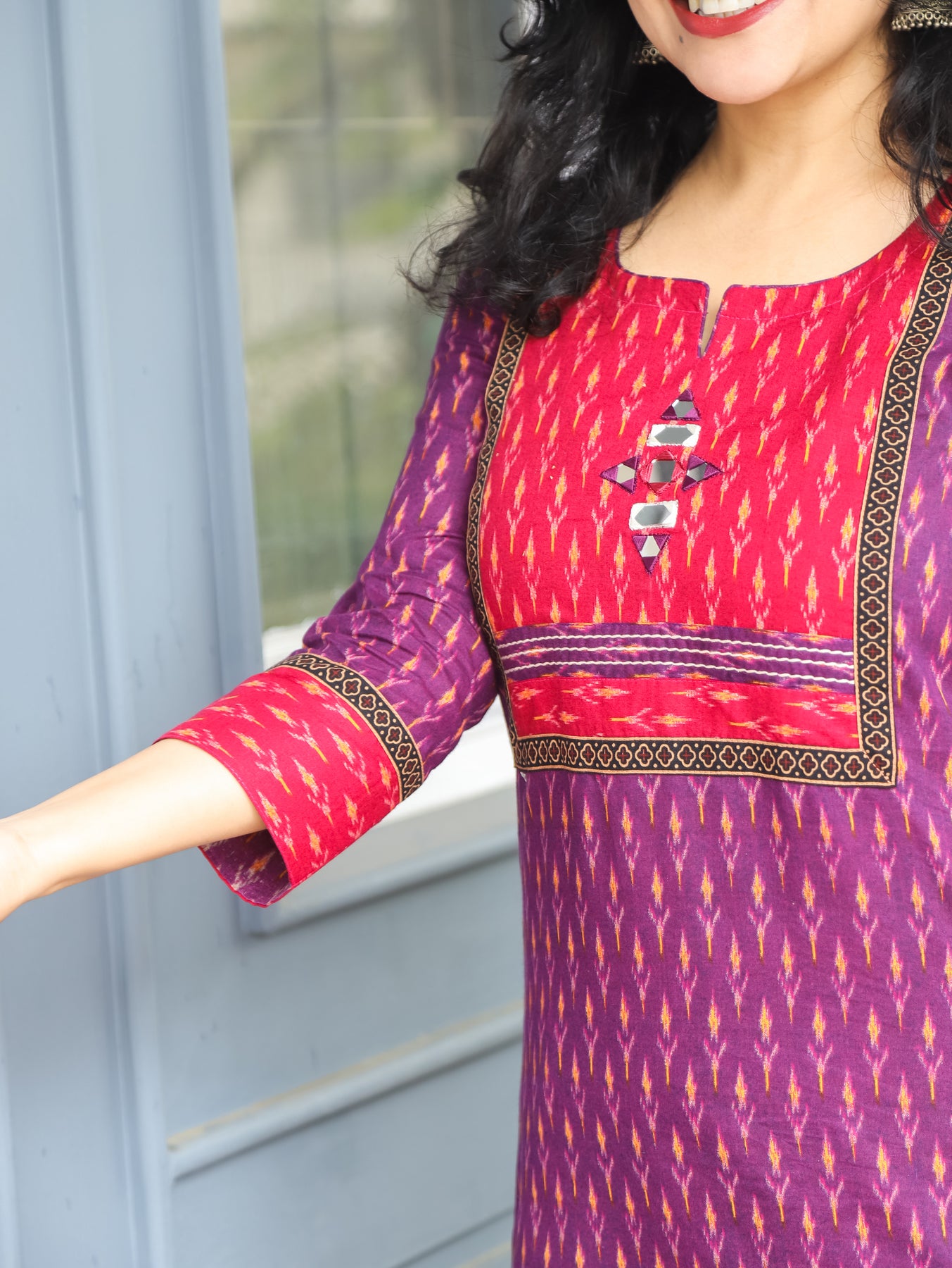 Neck: Ikkat Print Yoke with Mirror