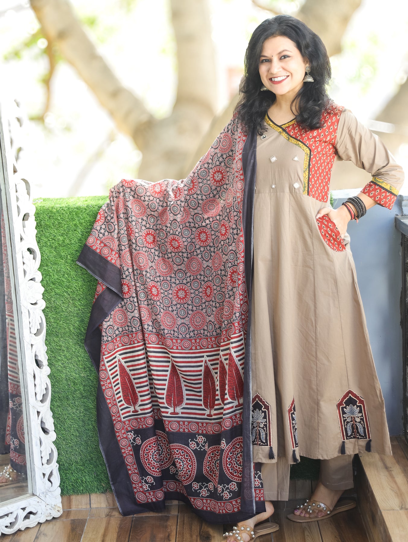 Sharvari Tan Hazel Ajrak with Mirror Angrakha Style Anarkali Cotton 3 Piece with Pocket