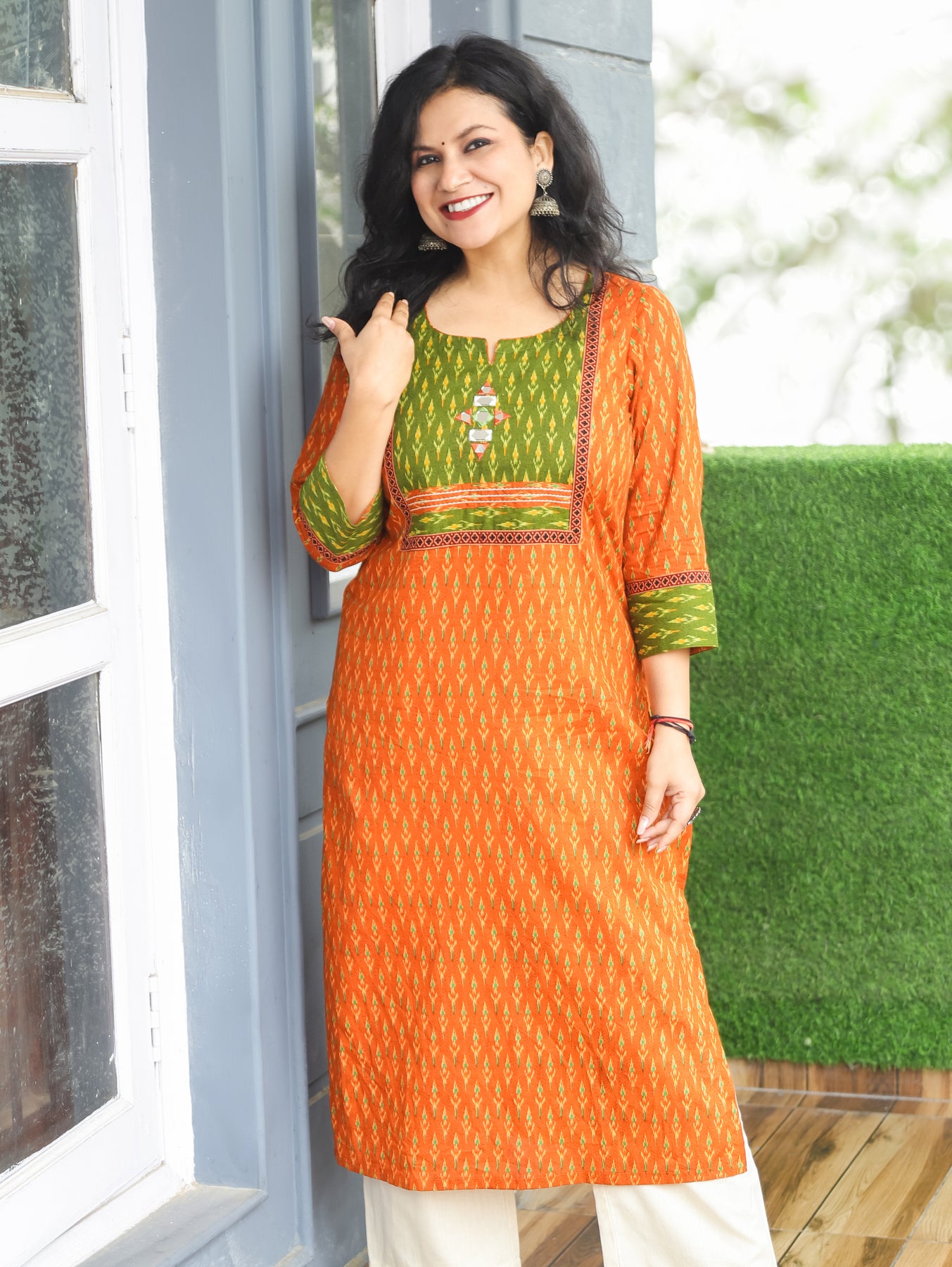 Kesariya Orange with Green Yoke with Mirror Work Ikkat Printed Cotton Kurti