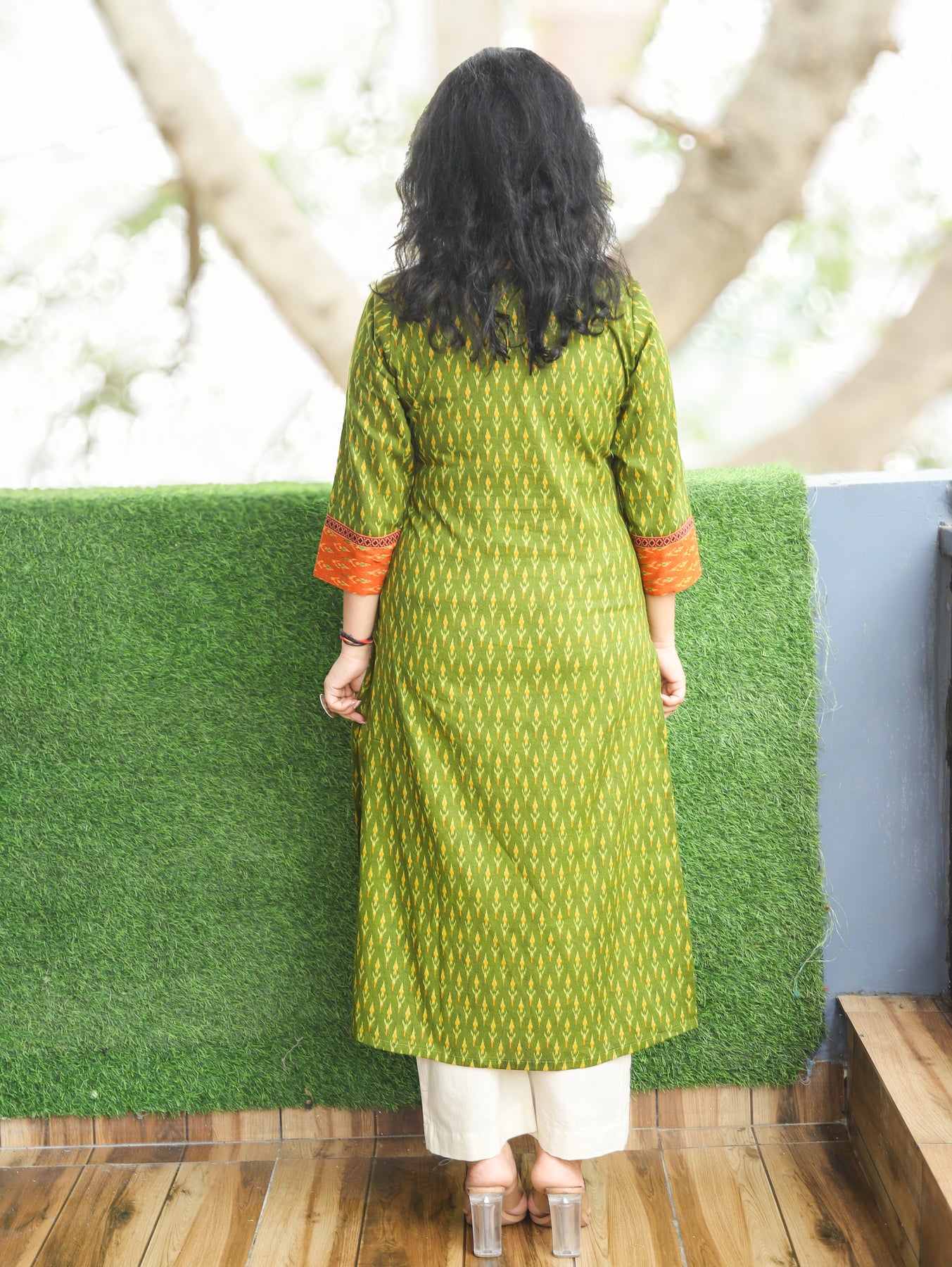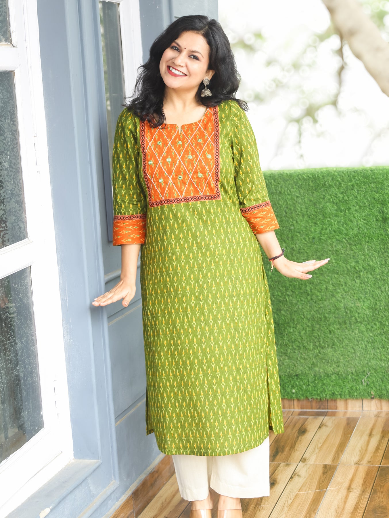 Kesariya Green with Orange Yoke with Mirror Work Ikkat Printed Cotton Kurti