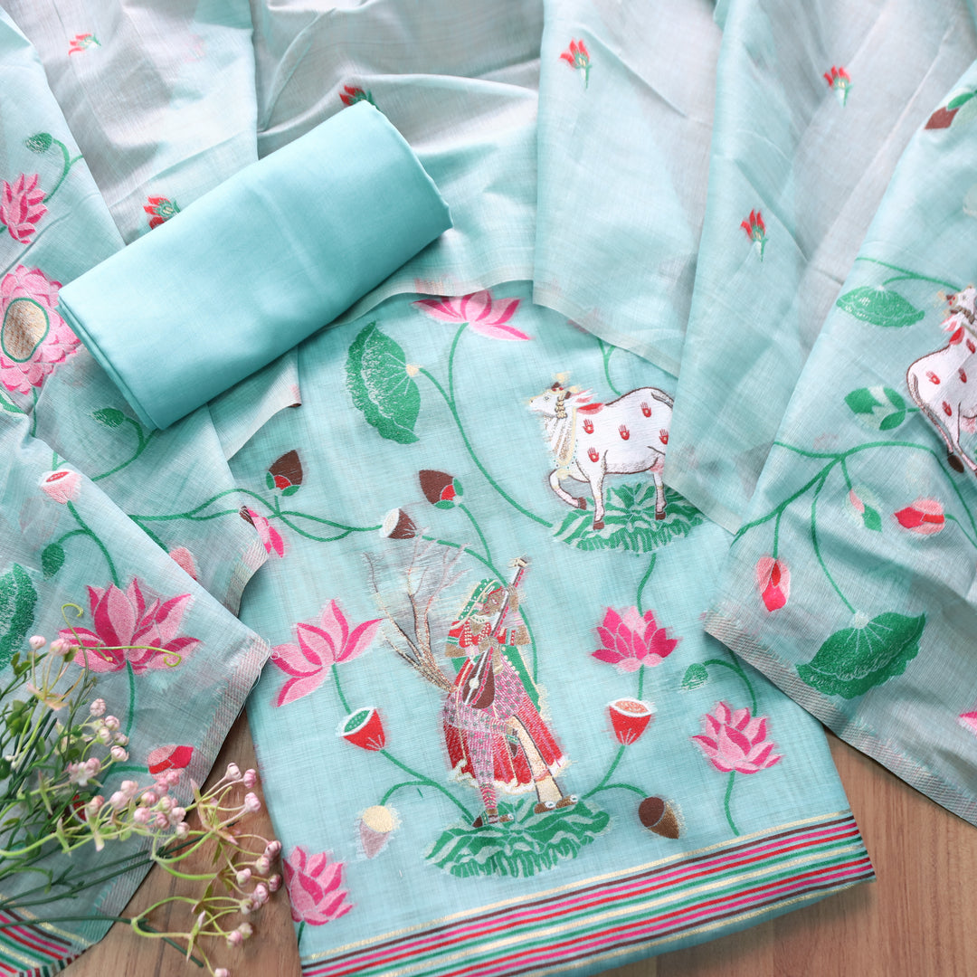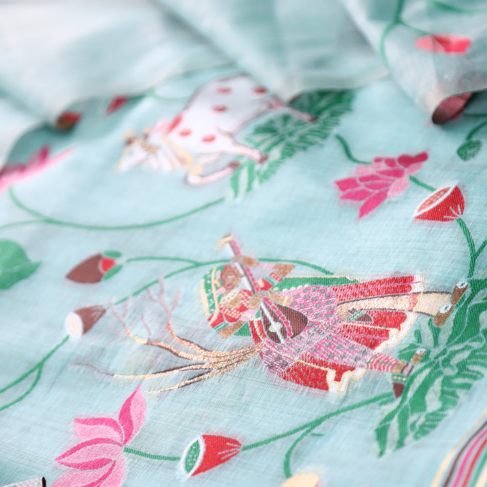 Khayal Minty Green Pichwai Authentic Jamdani Weaved Hemline Chanderi Suit Set
