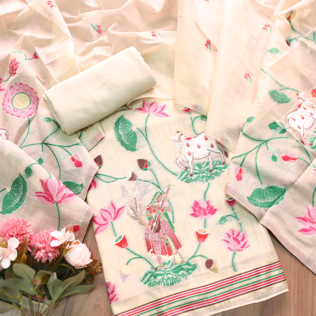 Khayal Buttermilk Beige Pichwai Authentic Jamdani Weaved Hemline Chanderi Suit Set