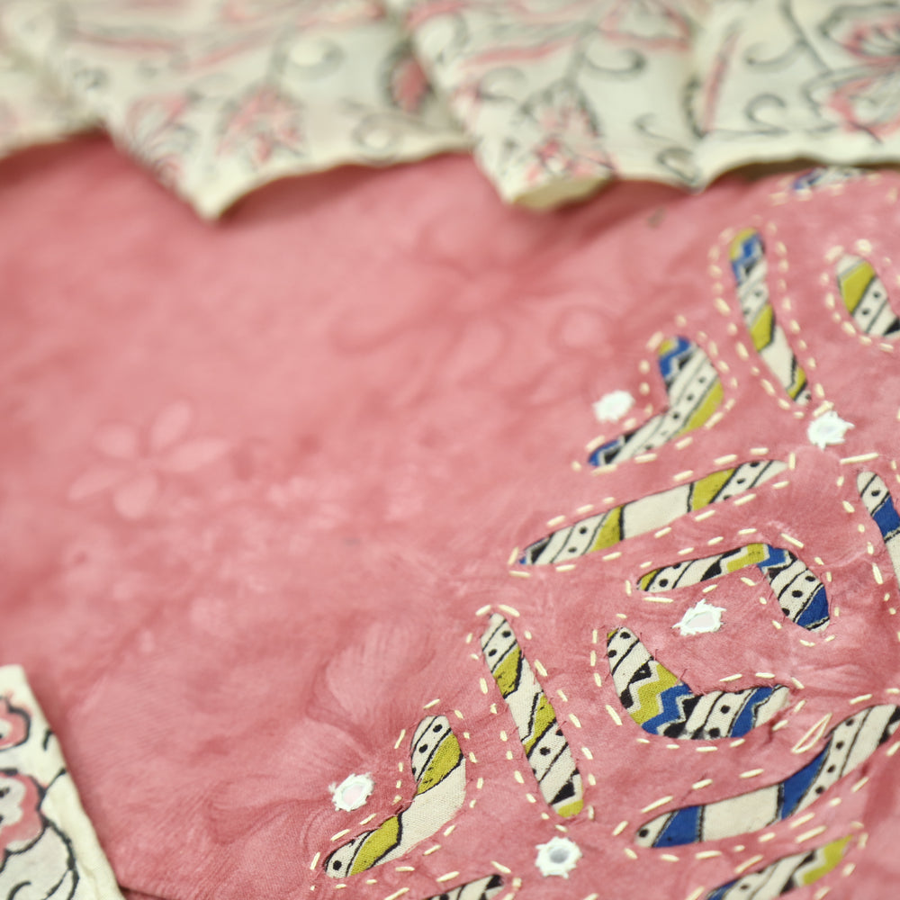 Sadhgi California Pink Self Printed Kalamkari Applique Work Jam Satin Cotton Set