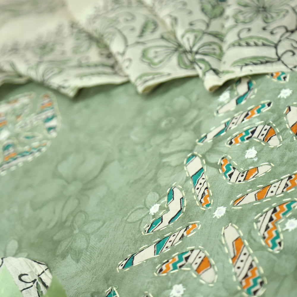 Sadhgi Sage Green Self Printed Kalamkari Applique Work Jam Satin Cotton Set