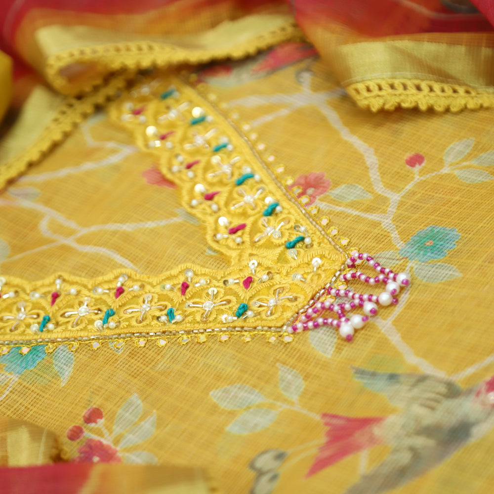 Sahiba Bright Yellow V Neck with Moti and Kardana Work Floral Print Kota Doriya Set