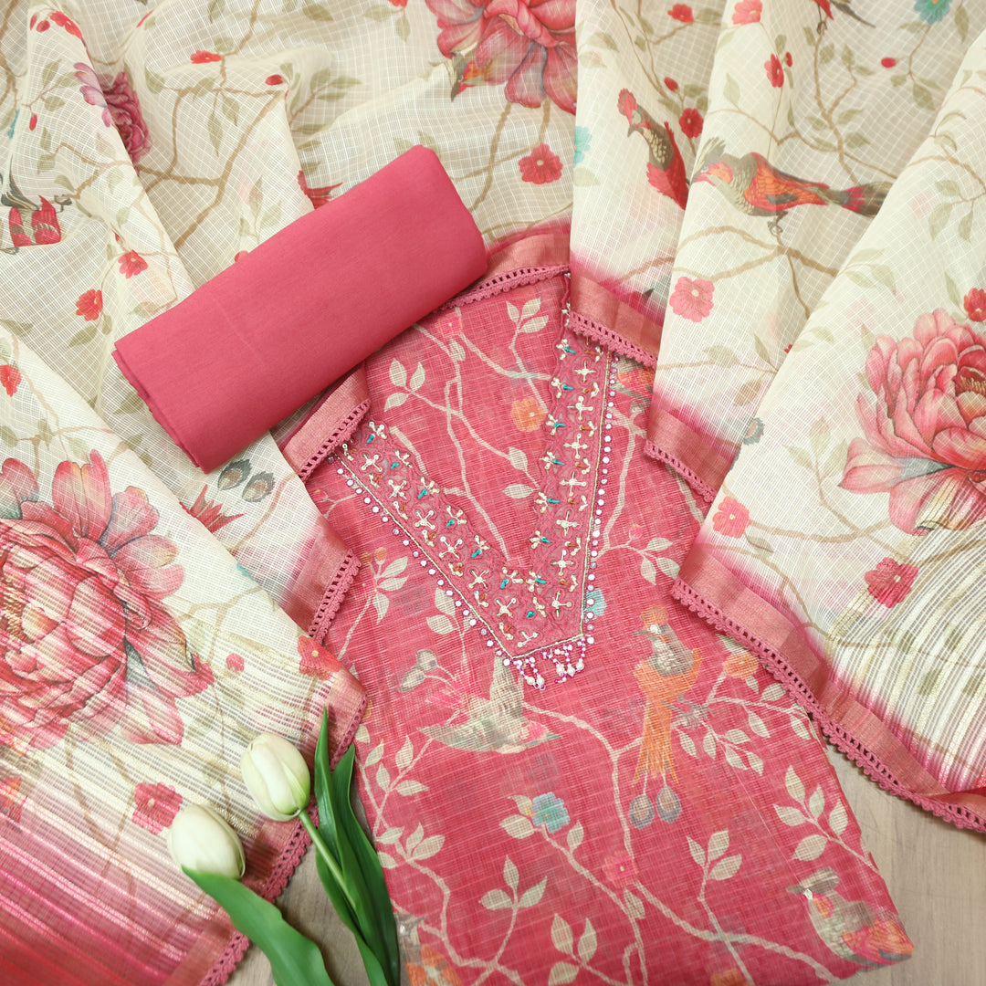 Sahiba Bright Pink V Neck with Moti and Kardana Work Floral Print Kota Doriya Set