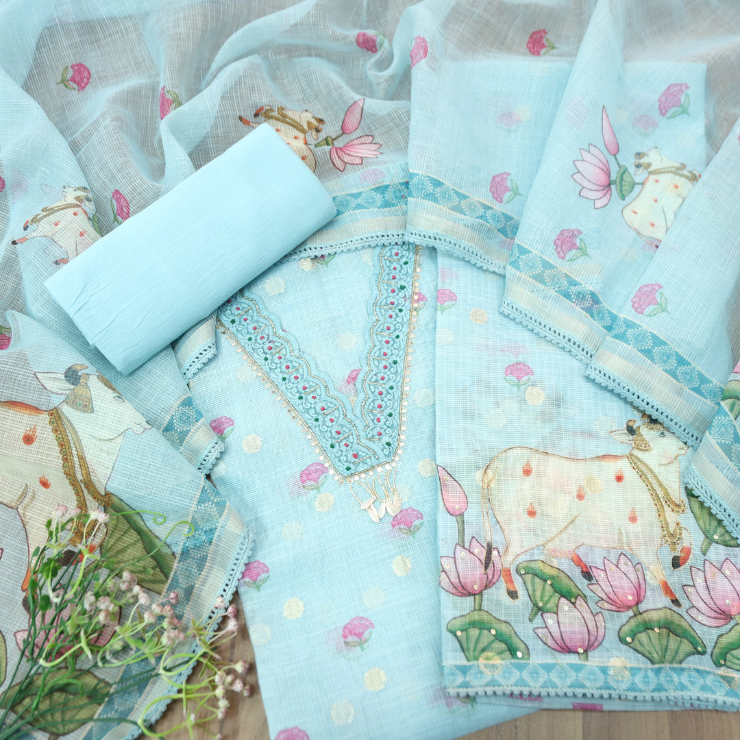 Khayal Powder Blue Pichwai Authentic Jamdani Weaved Hemline Chanderi Suit Set