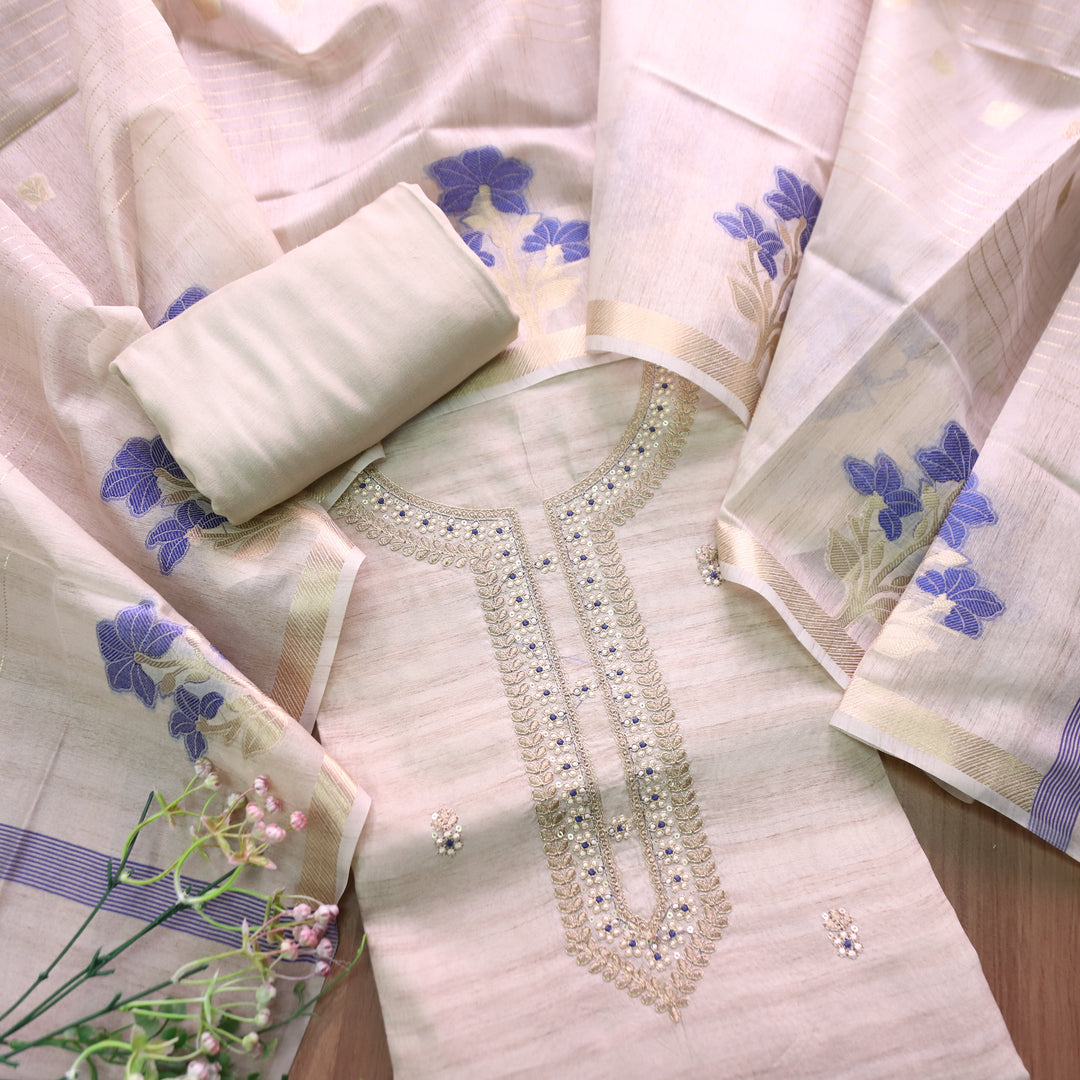 नुसरत Cream White with Blue Thread and Embellished Work Tussar look Chanderi Set