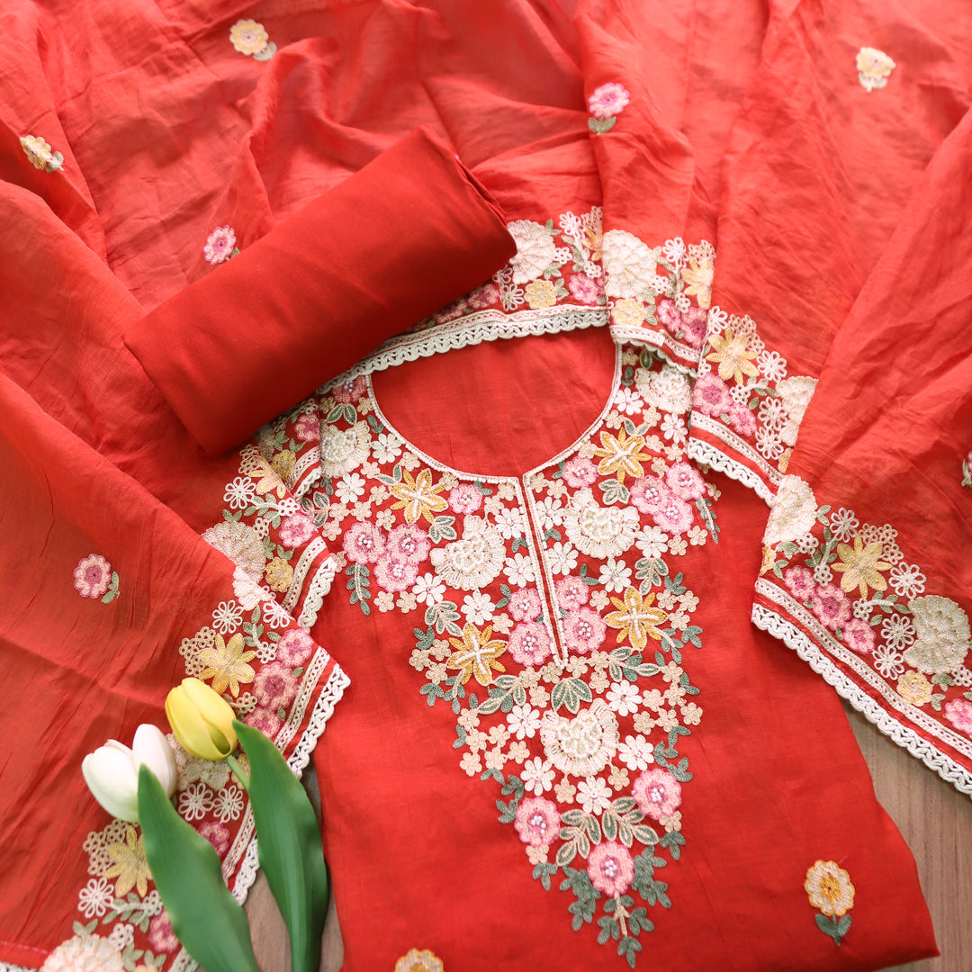 Hoor Rust Burnt Orange Thread Embroidered with Moti Work Mul Chanderi Set