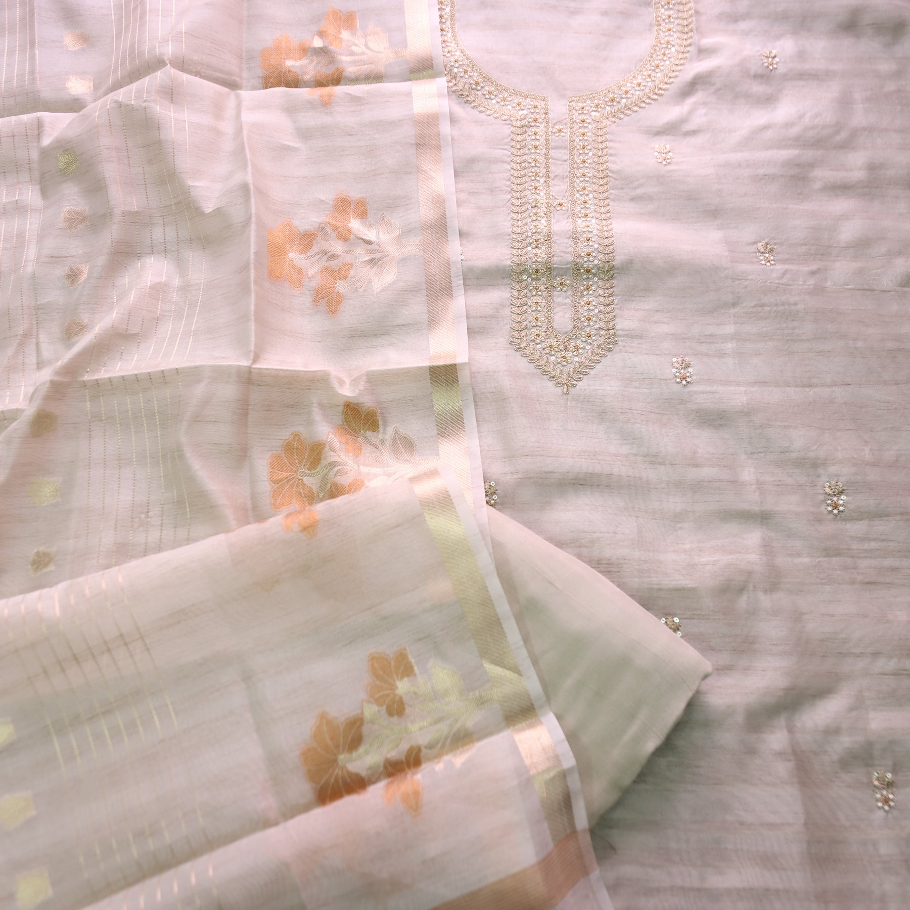 Description- An elegant tussar-look chanderi suit set featuring a beautifully embellished neckline with fine thread work. It is paired with a woven chanderi dupatta showcasing subtle floral motifs and a plain bottom, making it a timeless blend of sophistication and charm.