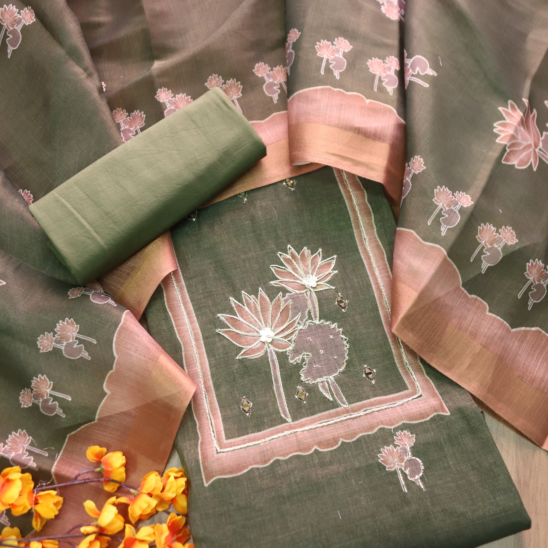Description- This elegant shimmer linen top is adorned with delicate Mirror and Zari weaved work, adding a subtle festive charm. It is paired with a comfortable cotton bottom for all-day ease. The look is beautifully completed with a shimmer linen digital printed dupatta, making this set perfect for both casual elegance and special occasions..