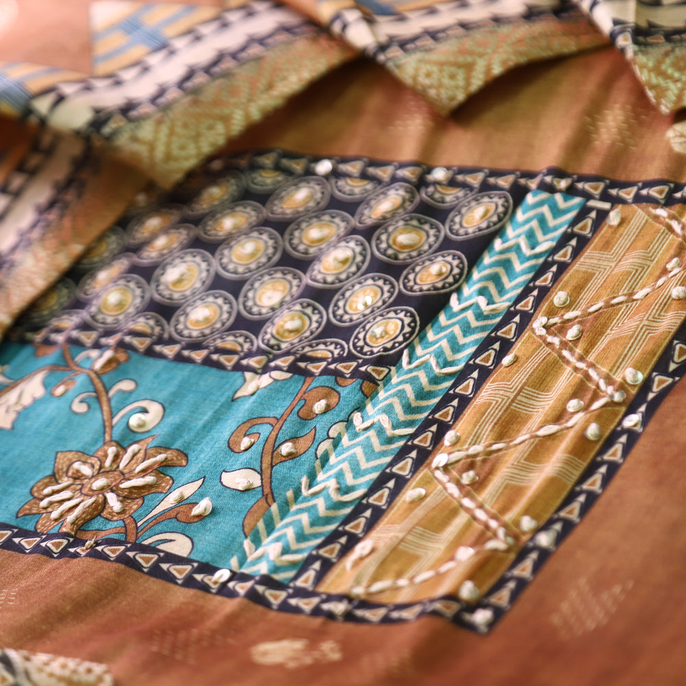 Alebli Peanut Brown Digital Printed Yoke with French Knot Work Art Chanderi Set