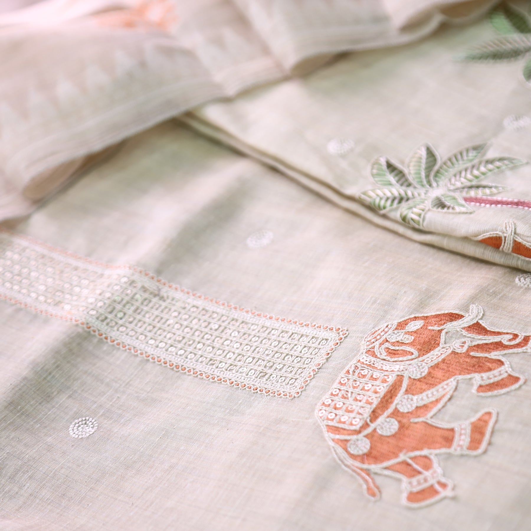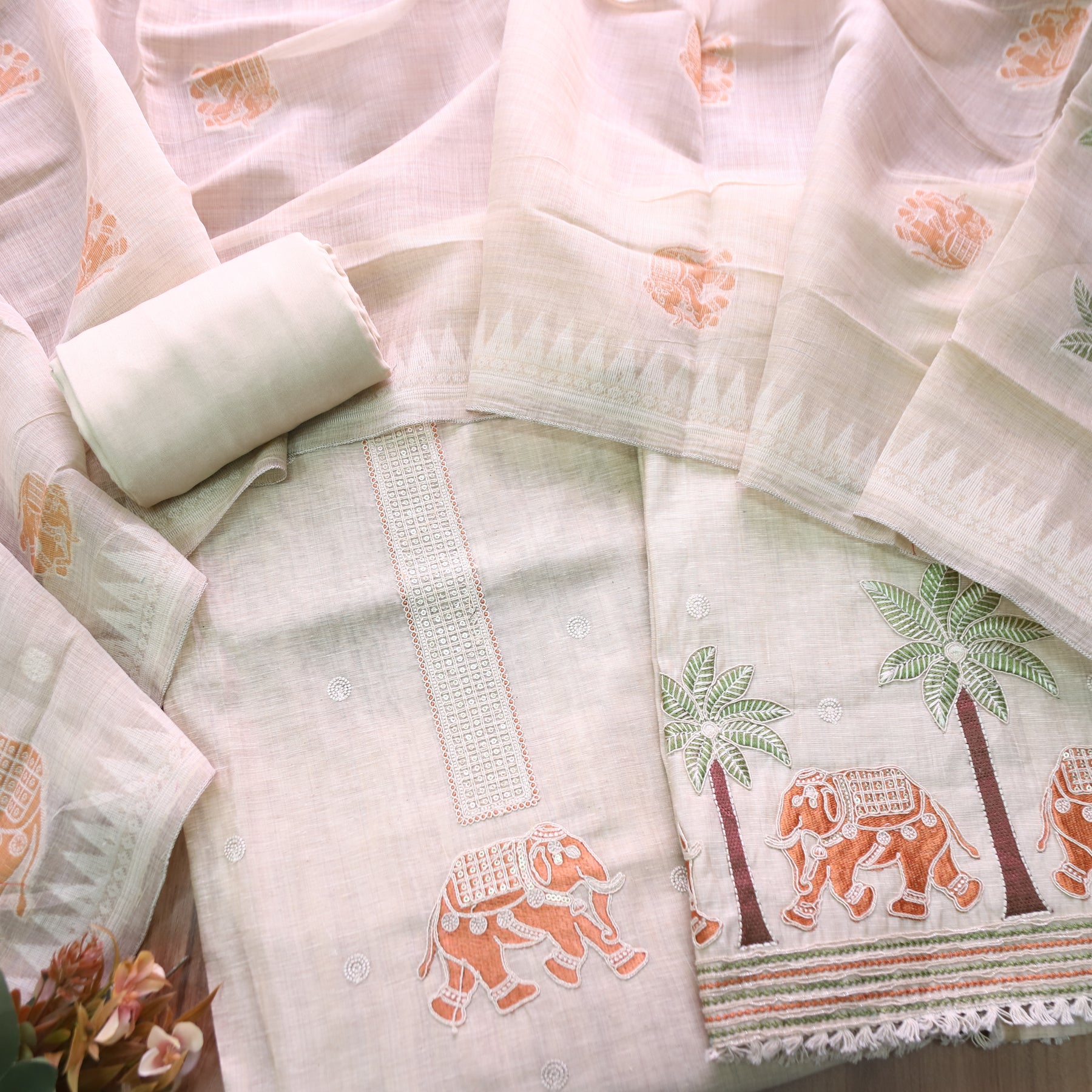 Ambarsari Skin Beige with Orange Elephant Embroidered Work Chanderi Suit Set