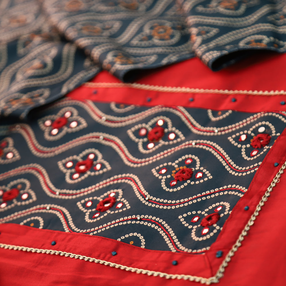 Gajgamini Cherry Red Mirror with Bandhani Print Mashru Patch Glazed Cotton Set