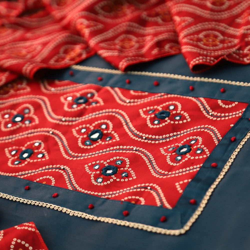 Gajgamini Denim Blue Mirror with Bandhani Print Mashru Patch Glazed Cotton Set