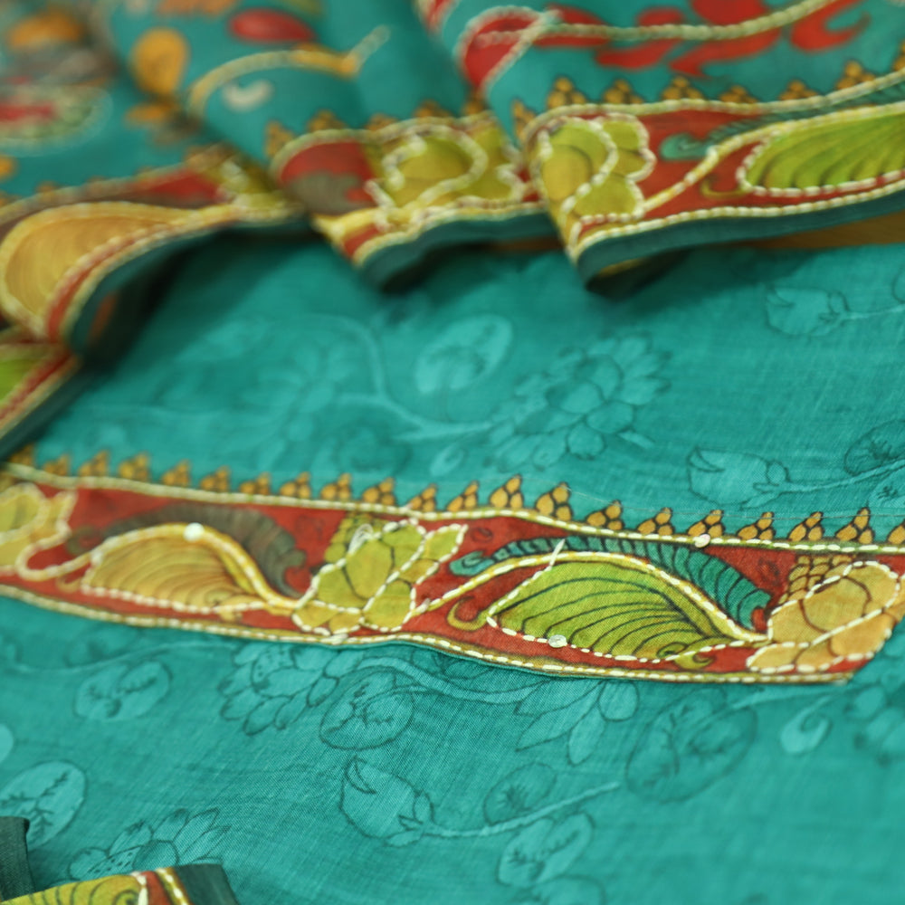 Pranavi Aqua Turquoise Self Printed in Kantha Embroidery Neck Work Chanderi Suit Set