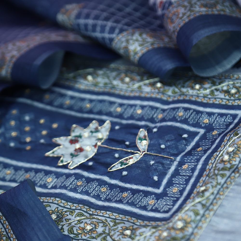 Khalasi Denim Blue Digital Printed with Spiral and Patra Work Art Silk Chanderi Set