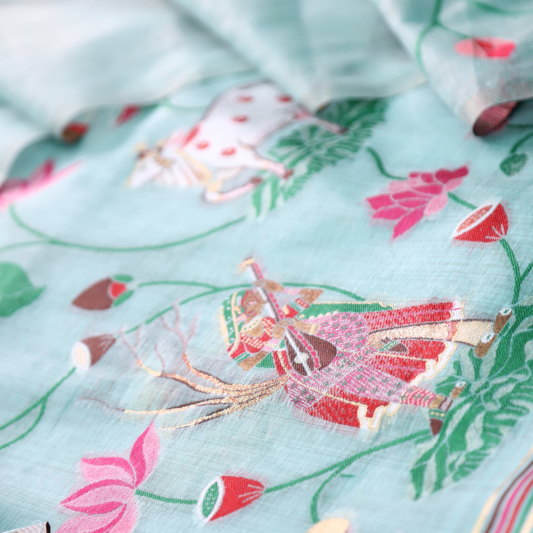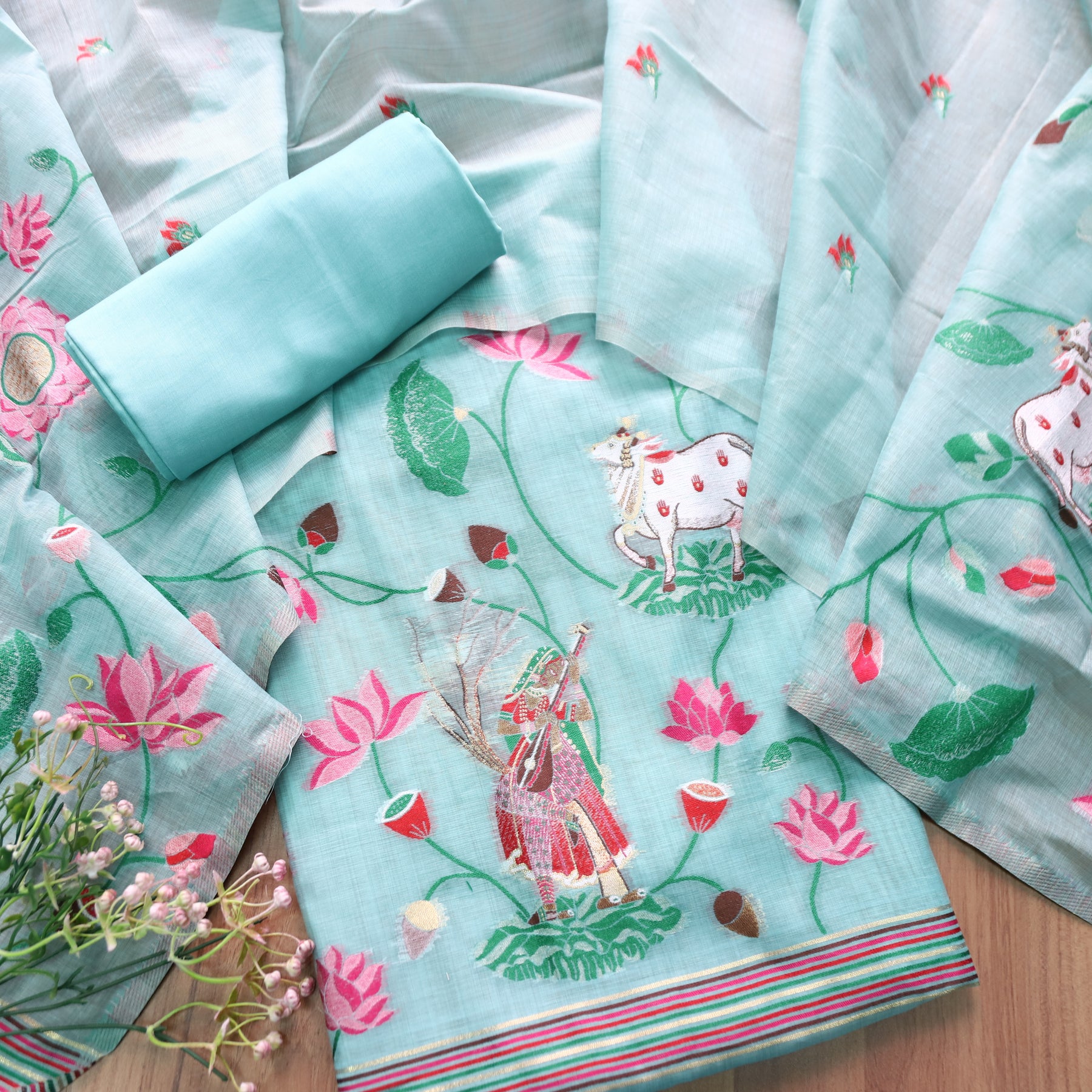 Khayal Powder Blue Pichwai Authentic Jamdani Weaved Hemline Chanderi Suit Set