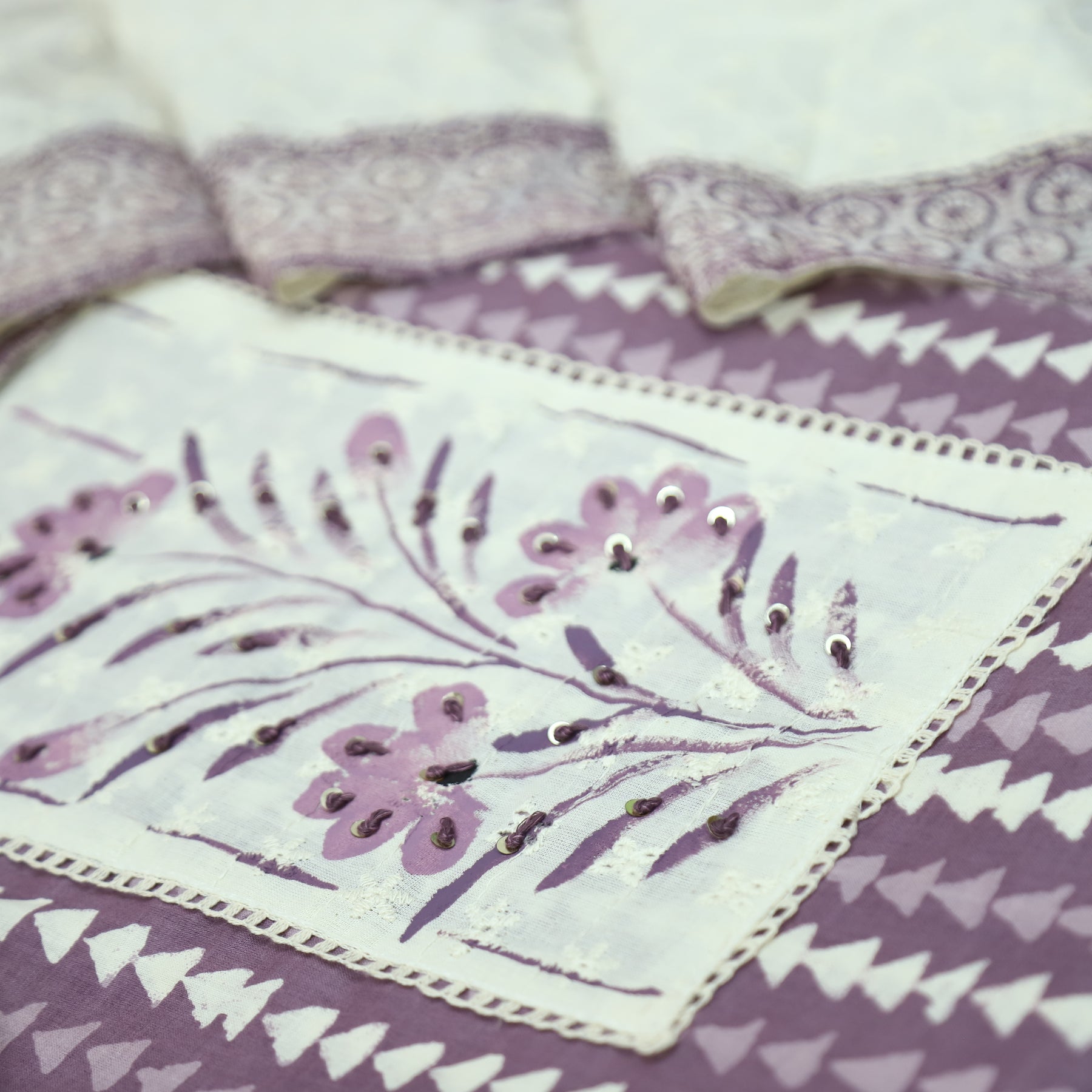 Klara Berry Purple Schiffli Neck Yoke with Thread and Paint Work Dabu Printed Cotton Set