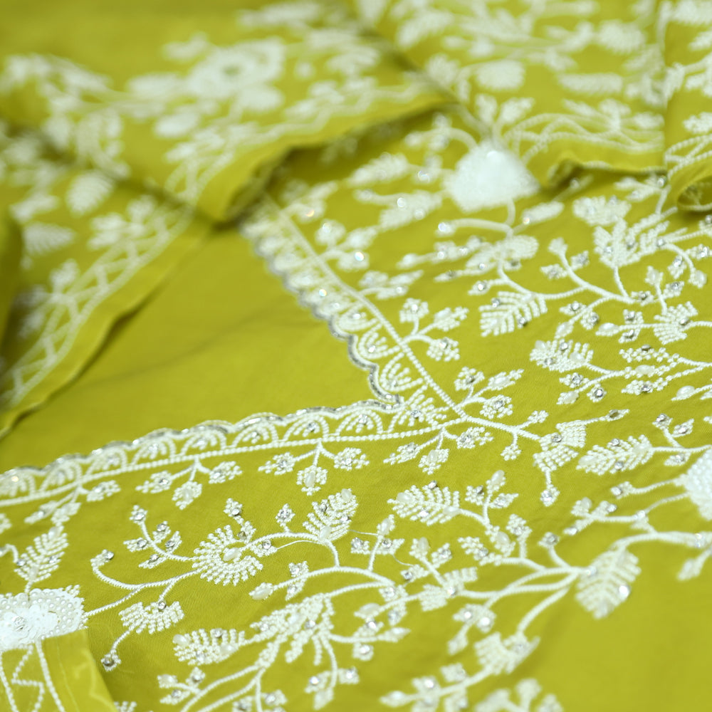 Mourya Lemon Yellow Thread Embroidered with Moti Work Organza Suit Set