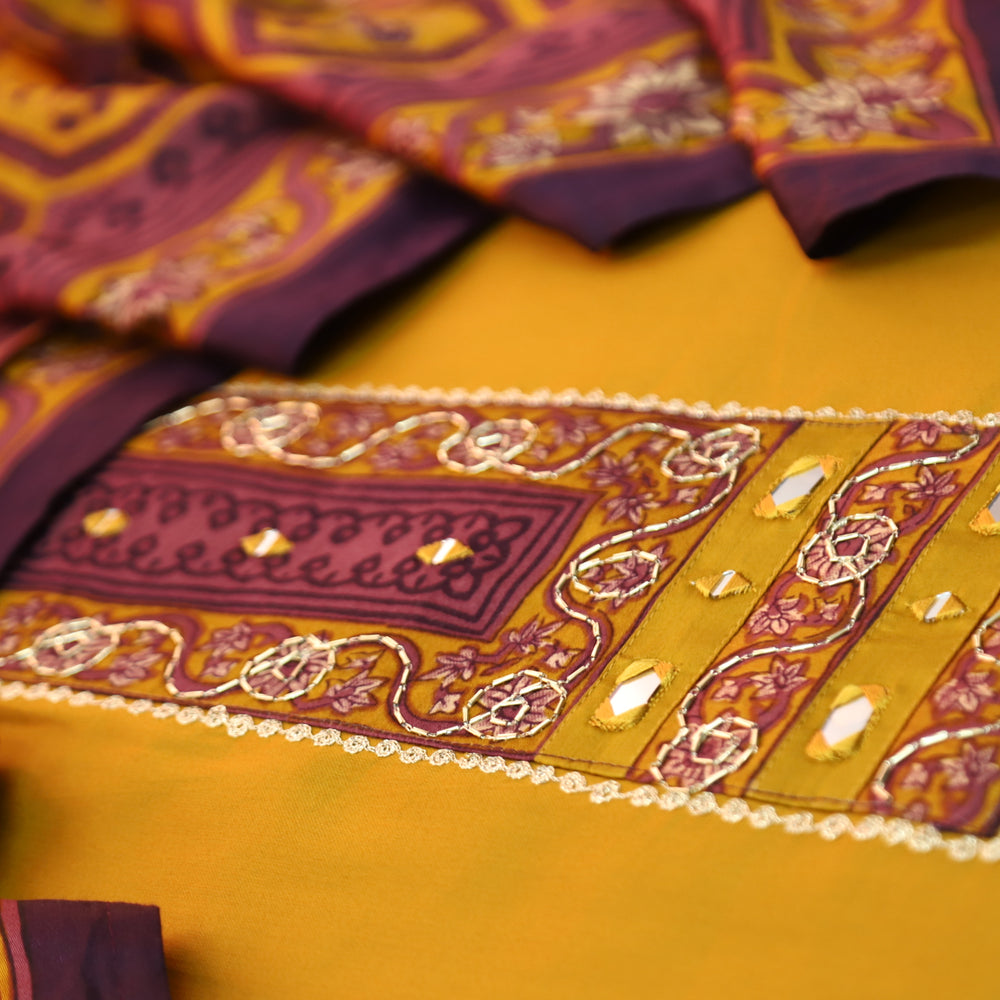 Nandini Dijon Yellow Printed Yoke with Kardana and Mirror Work Glazed Cotton Set