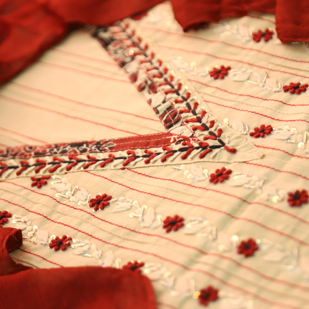Description- A cotton base adorned with fine vertical pintuck lines, embellished with delicate French knot and tiny red floral motifs. A contrast floral print cotton bottom for added elegance. elegant chiffon dupatta in matching maroon, featuring soft bandhej patterns and a flowy, lightweight texture that complements the overall ensemble.